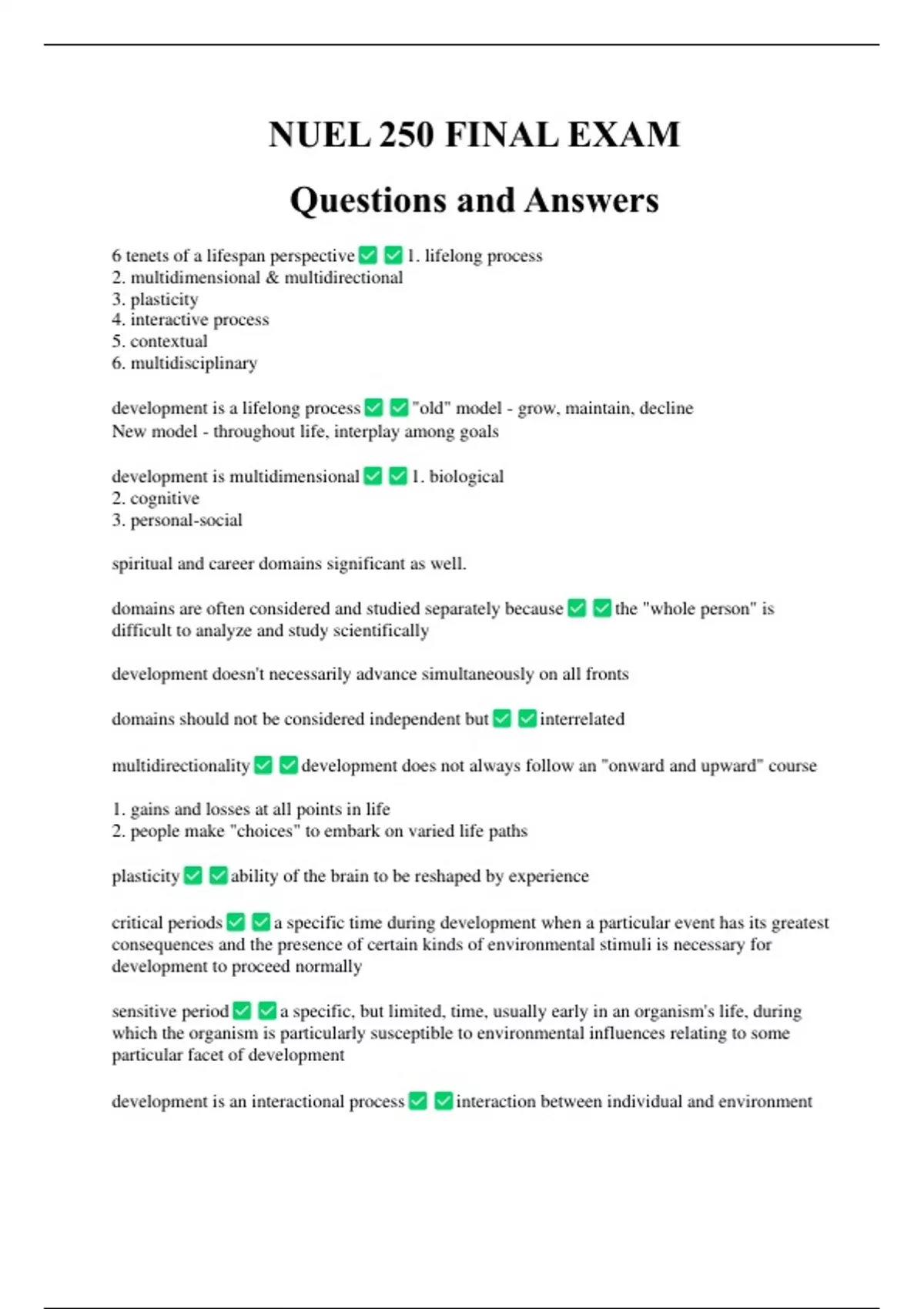 6 tenets of a lifespan perspective 1. lifelong process 2. multidimensional & multidirectional 3. plasticity 4. interactive process 5. contextual 6. multidisciplinary development is a lifelong process "old" model - grow, maintain, decline New model - throughout life, interplay among goals development is multidimensional 1. biological 2. cognitive 3. personal-social spiritual and career domains significant as well. domains are often considered and studied separately because the "whole person" is difficult to analyze and study scientifically development doesn't necessarily advance simultaneously on all fronts domains should not be considered independent but interrelated multidirectionality development does not always follow an "onward and upward" course 1. gains and losses at all points in life 2. people make "choices" to embark on varied life paths plasticity ability of the brain to be reshaped by experience critical periods a specific time during development when a particular event has its greatest consequences and the presence of certain kinds of environmental stimuli is necessary for development to proceed normally sensitive period a specific, but limited, time, usually early in an organism's life, during which the organism is particularly susceptible to environmental influences relating to some particular facet of development development is an interactional process interaction between individual and environment 1. individual and environment form a system 2. influence is "bi-directional" Contexts of a person biological makeup physical environment cognitive processes historical contexts social contexts cultural context normative age-graded influences influences that are similar for individuals in a particular age group normative history-graded influences influences that are common to people of a particular generation because of