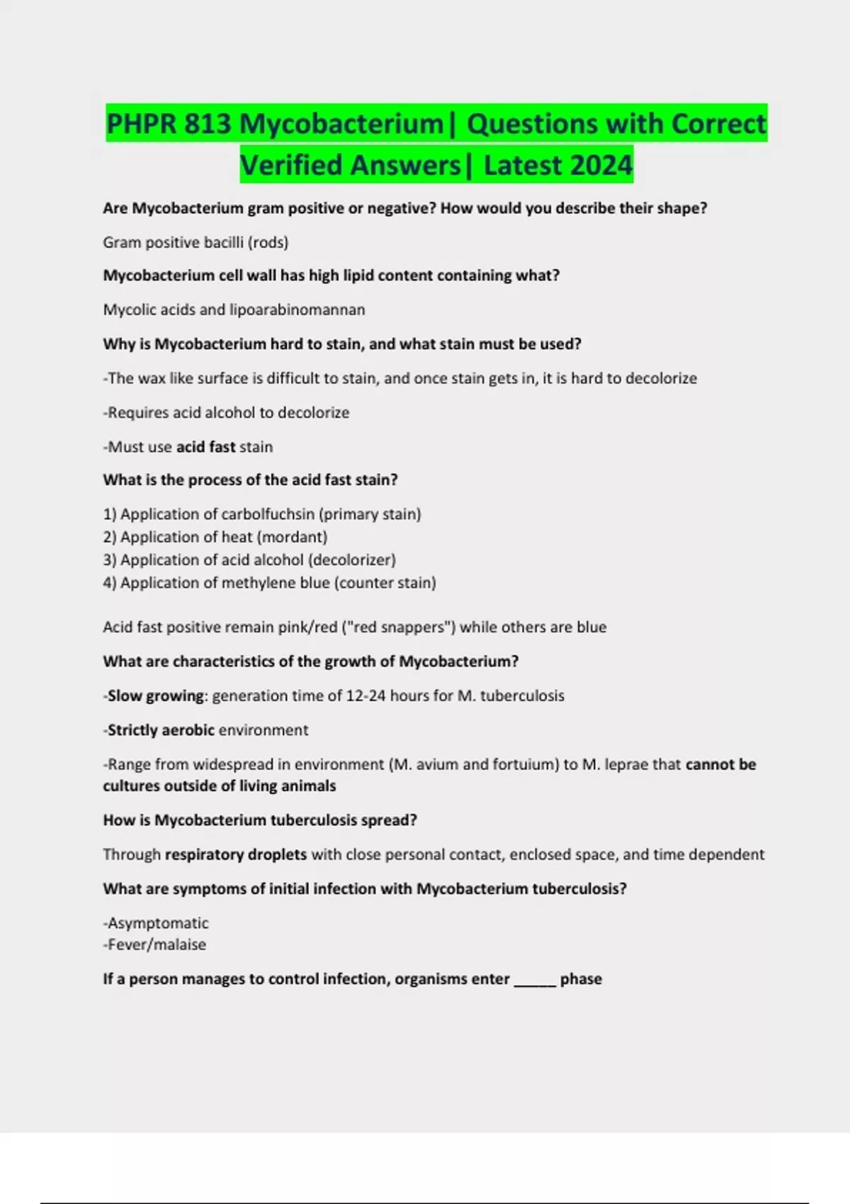 PHPR 813 Mycobacterium| Questions with Correct Verified Answers| Latest 2024