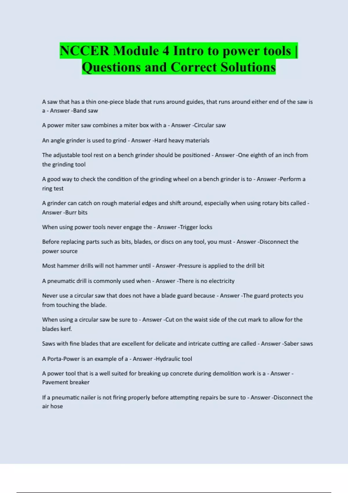 NCCER Module 4 Intro to power tools | Questions and Correct Solutions A saw that has a thin one-piece blade that runs around guides, that runs around either end of the saw is a - Answer -Band saw A power miter saw combines a miter box with a - Answer -Circular saw An angle grinder is used to grind - Answer -Hard heavy materials The adjustable tool rest on a bench grinder should be positioned - Answer -One eighth of an inch from the grinding tool A good way to check the condition of the grinding wheel on a bench grinder is to - Answer -Perform a ring test A grinder can catch on rough material edges and shift around, especially when using rotary bits called - Answer -Burr bits When using power tools never engage the - Answer -Trigger locks Before replacing parts such as bits, blades, or discs on any tool, you must - Answer -Disconnect the power source Most hammer drills will not hammer until - Answer -Pressure is applied to th