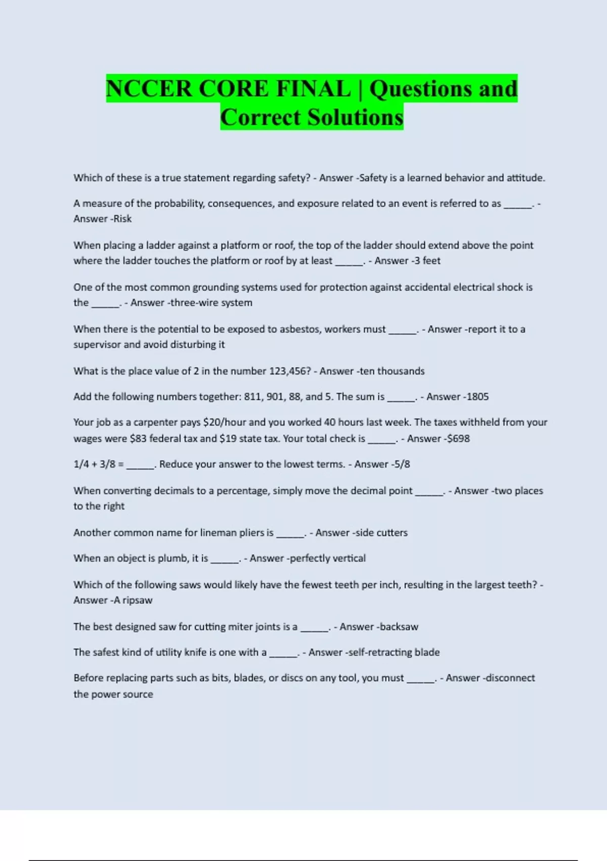 NCCER CORE FINAL | Questions and Correct Solutions Which of these is a true statement regarding safety? - Answer -Safety is a learned behavior and attitude. A measure of the probability, consequences, and exposure related to an event is referred to as _____. - Answer -Risk When placing a ladder against a platform or roof, the top of the ladder should extend above the point where the ladder touches the platform or roof by at least _____. - Answer -3 feet One of the most common grounding systems used for protection against accidental electrical shock is the _____. - Answer -three-wire system When there is the potential to be exposed to asbestos, workers must _____. - Answer -report it to a supervisor and avoid disturbing it What is the place value of 2 in the number 123,456? - Answer -ten thousands Add the following numbers together: 811, 901, 88, and 5. The sum is _____. - Answer -1805 Your job as a carpenter pays $20/hour and you worked 40 hours last week. The taxes withheld from your wages were $83 federal tax and $19 state tax. Your total check is _____. - Answer -$698 1/4 + 3/8 = _____. Reduce your answer to the lowest terms. - Answer -5/8 When converting decimals to a percentage, simply move the decimal point _____. - Answer -two places to the right Another common name for lineman pliers is _____. - Answer -side cutters When an object is plumb, it is _____. - Answer -perfect
