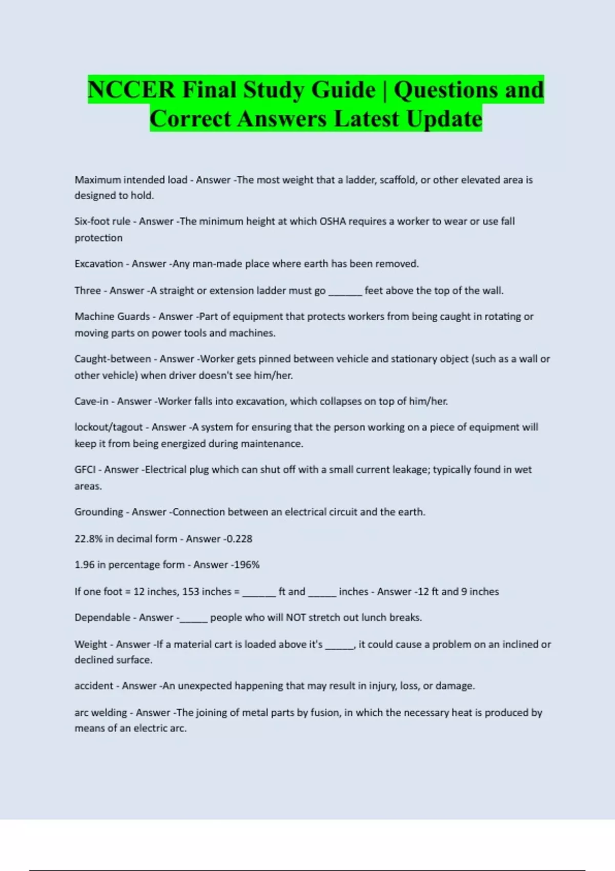 NCCER Final Study Guide | Questions and Correct Answers Latest Update Maximum intended load - Answer -The most weight that a ladder, scaffold, or other elevated area is designed to hold. Six-foot rule - Answer -The minimum height at which OSHA requires a worker to wear or use fall protection Excavation - Answer -Any man-made place where earth has been removed. Three - Answer -A straight or extension ladder must go ______ feet above the top of the wall. Machine Guards - Answer -Part of equipment that protects workers from being caught in rotating or moving parts on power tools and machines. Caught-between - Answer -Worker gets pinned between vehicle and stationary object (such as a wall or other vehicle) when driver doesn't see him/her. Cave-in - Answer -Worker falls into excavation, which collapses on top of him/her. lockout/tagout - Answer -A system for ensuring that the person working on a piece of equipment will keep it from being energized during maintenance. GFCI - Answer -Electrical plug which can shut off with a small current leakage; typically found in wet areas. Grounding - Answer -Connection between an electrical circuit and the earth. 22.8% in decimal form - Answer -0.228 1.96 in percentage form - Answer -196% If one foot = 12 inches, 153 inches = ______ ft and _____ inches - Answer -12 ft and 9 inches Dependable - Answer -_____ people who will NOT stretch ou