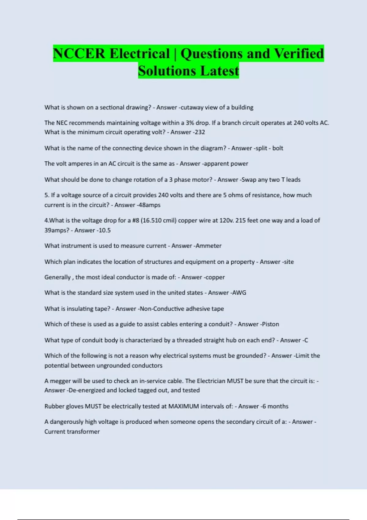 NCCER Electrical | Questions and Verified Solutions Latest What is shown on a sectional drawing? - Answer -cutaway view of a building The NEC recommends maintaining voltage within a 3% drop. If a branch circuit operates at 240 volts AC. What is the minimum circuit operating volt? - Answer -232 What is the name of the connecting device shown in the diagram? - Answer -split - bolt The volt amperes in an AC circuit is the same as - Answer -apparent power What should be done to change rotation of a 3 phase motor? - Answer -Swap any two T leads 5. If a voltage source of a circuit provides 240 volts and there are 5 ohms of resistance, how much current is in the circuit? - Answer -48amps 4.What is the voltage drop for a #8 (16.510 cmil) copper wire at 120v. 215 feet one way and a load of 39amps? - Answer -10.5 What instrument is used to measure current - Answer -Ammeter Which plan indicates the location of structures and equipment on a property - Answer -site Generally , the most ideal conductor is made of: - Answer -copper What is the standard size system used in the united states - Answer -AWG What is insulating tape? - Answer -Non-Conductive adhesive tape Which of these is used as a guide to assist cables entering a co