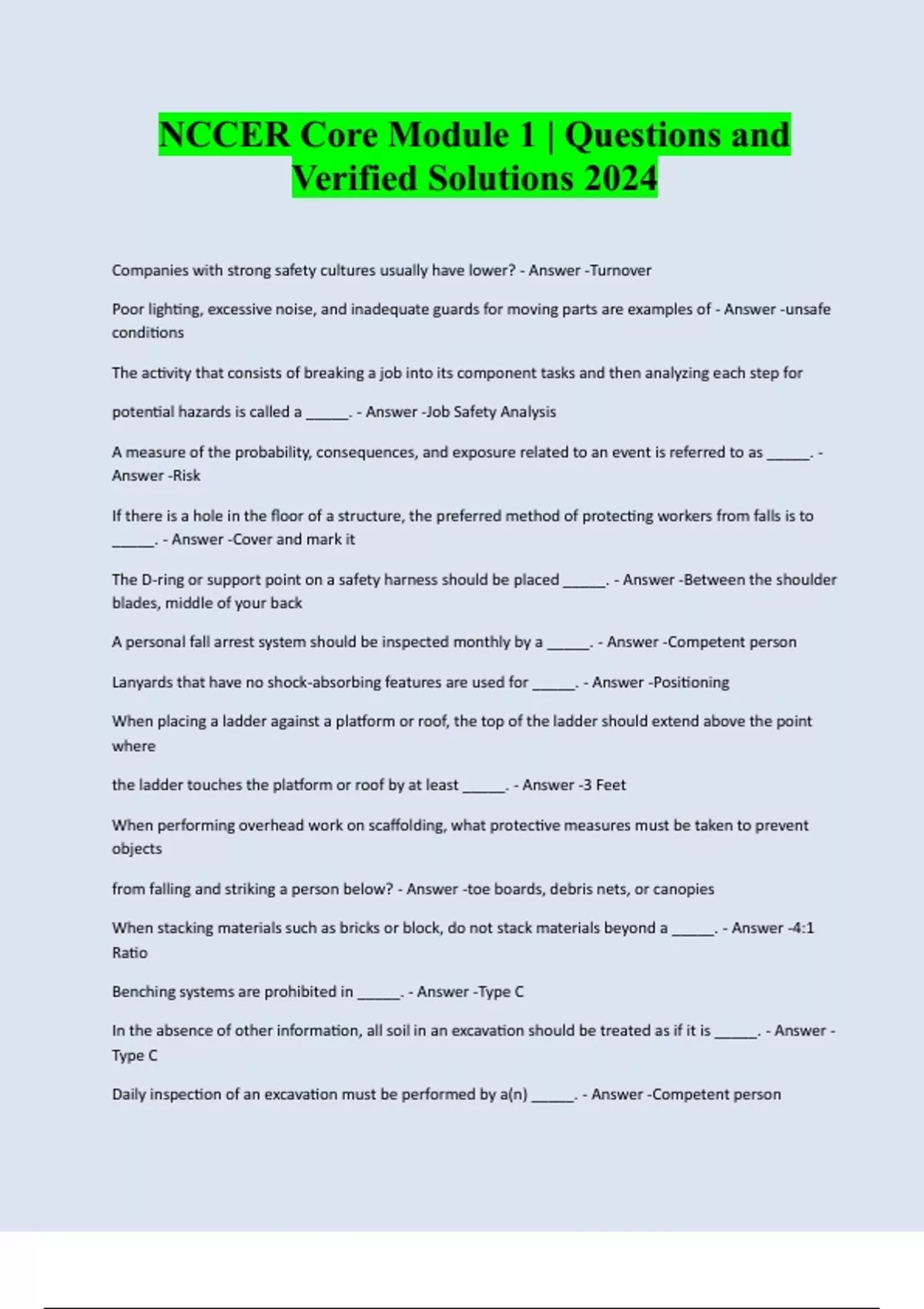 NCCER Core Module 1 | Questions and Verified Solutions 2024 Companies with strong safety cultures usually have lower? - Answer -Turnover Poor lighting, excessive noise, and inadequate guards for moving parts are examples of - Answer -unsafe conditions The activity that consists of breaking a job into its component tasks and then analyzing each step for potential hazards is called a _____. - Answer -Job Safety Analysis A measure of the probability, consequences, and exposure related to an event is referred to as _____. - Answer -Risk If there is a hole in the floor of a structure, the preferred method of protecting workers from falls is to _____. - Answer -Cover and mark it The D-ring or support point on a safety harness should be placed _____. - Answer -Between the shoulder blades, middle of your back A personal fall arrest system should be inspected monthly by a _____. - Answer -Competent person Lanyards that have no shock-absorbing features are used for _____. - Answer -Positioning When placing a ladder against a platform or roof, the top of the ladder should extend above the point where the ladder touches the platform or roof by at least _____. - Answer -3 Feet When performing overhead work on scaffolding, what protective measures must be taken to prevent objects from falling and striking a person below? - Answer -toe boards, debris nets, or canopies When stacking materials such as bricks or block, do not stack materials beyond a _____. - Answer -4:1 Ratio Benching systems are prohibited in _____. - Answer -Type C