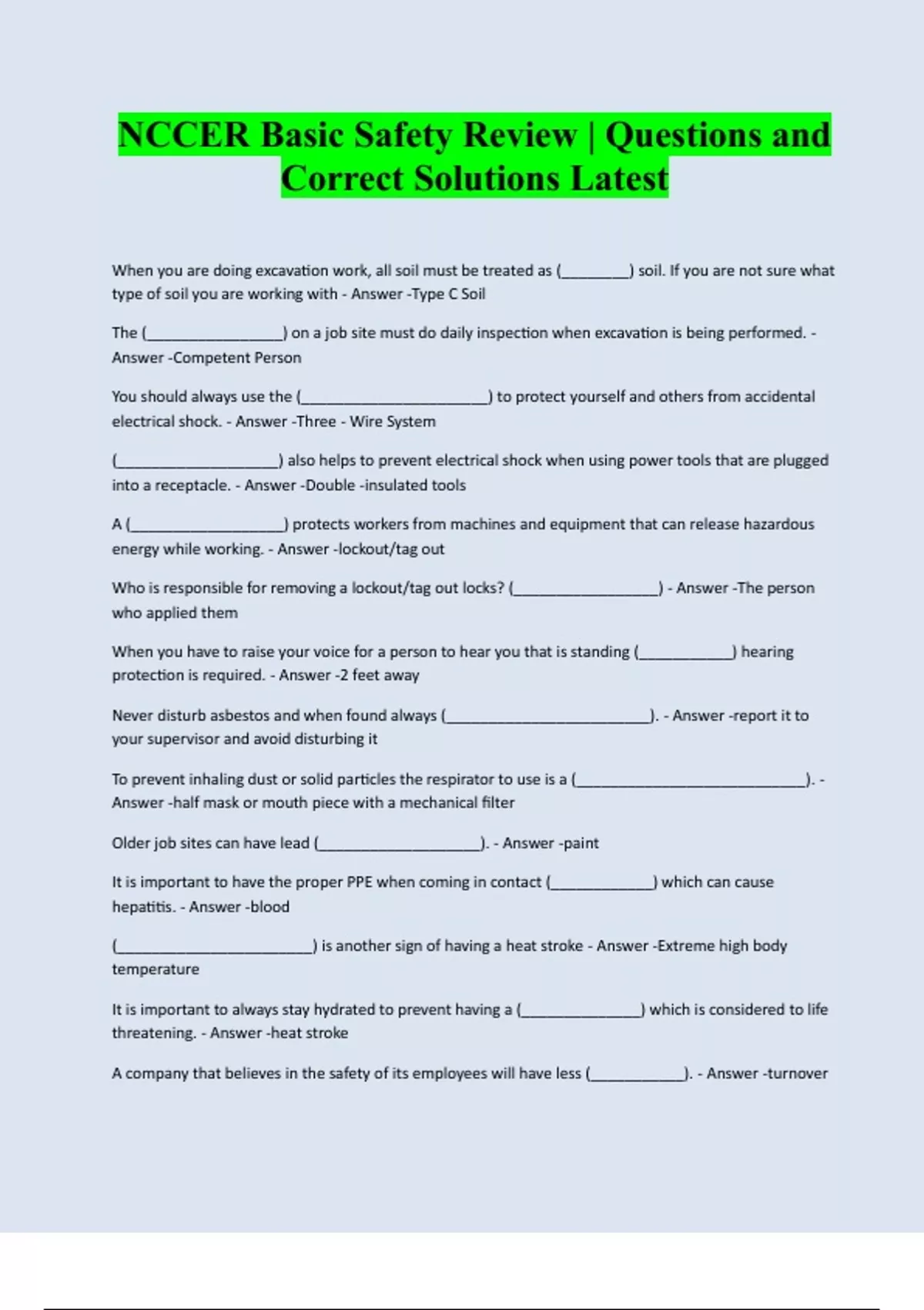 NCCER Basic Safety Review | Questions and Correct Solutions Latest When you are doing excavation work, all soil must be treated as (________) soil. If you are not sure what type of soil you are working with - Answer -Type C Soil The (________________) on a job site must do daily inspection when excavation is being performed. - Answer -Competent Person You should always use the (______________________) to protect yourself and others from accidental electrical shock. - Answer -Three - Wire System (___________________) also helps to prevent electrical shock when using power tools that are plugged into a receptacle. - Answer -Double -insulated tools A (__________________) protects workers from machines and equipment that can release hazardous energy while working. - Answer -lockout/tag out Who is responsible for removing a lockout/tag out locks? (_________________) - Answer -The person who applied them When you have to raise your voice for a person to hear you that is standing (___________) hearing protection is required. - Answer -2 feet away Never disturb asbestos and when found always (________________________). - Answer -report it to your supervisor and avoid disturbing it