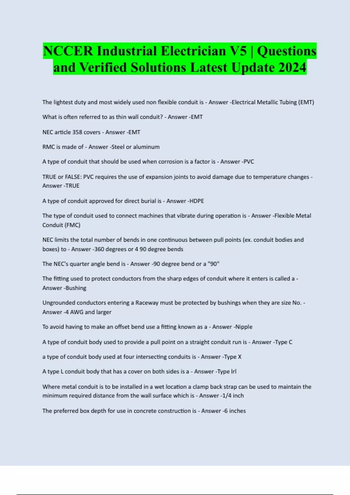 NCCER Industrial Electrician V5 | Questions and Verified Solutions Latest Update 2024 The lightest duty and most widely used non flexible conduit is - Answer -Electrical Metallic Tubing (EMT) What is often referred to as thin wall conduit? - Answer -EMT NEC article 358 covers - Answer -EMT RMC is made of - Answer -Steel or aluminum A type of conduit that should be used when corrosion is a factor is - Answer -PVC TRUE or FALSE: PVC requires the use of expansion joints to avoid damage due to temperature changes - Answer -TRUE A type of conduit approved for direct burial is - Answer -HDPE The type of conduit used to connect machines that vibrate during operation is - Answer -Flexible Metal Conduit (FMC) NEC limits the total number of bends in one continuous between pull points (ex. conduit bodies and boxes) to - Answer -360 degrees or 4 90 degree bends The NEC's quarter angle bend is - Answer -90 degree bend or a "90" The fitting used to protect conductors from the sharp edges of conduit where it enters is calle