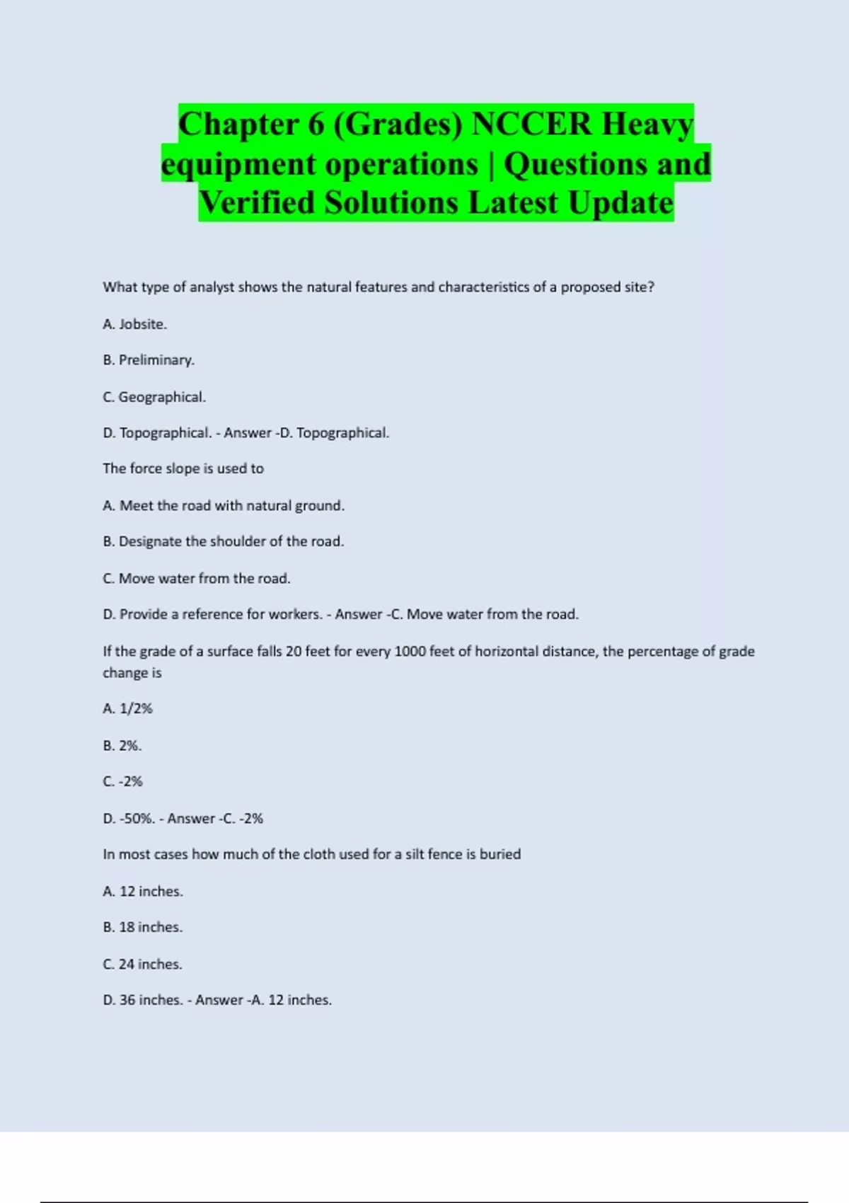 Chapter 6 (Grades) NCCER Heavy equipment operations | Questions and Verified Solutions Latest Update What type of analyst shows the natural features and characteristics of a proposed site? A. Jobsite. B. Preliminary. C. Geographical. D. Topographical. - Answer -D. Topographical. The force slope is used to A. Meet the road with natural ground. B. Designate the shoulder of the road. C. Move water from the road. D. Provide a reference for workers. - Answer -C. Move water from the road. If the grade of a surface falls 20 feet for every 1000 feet of horizontal distance, the percentage of grade change is A. 1/2%