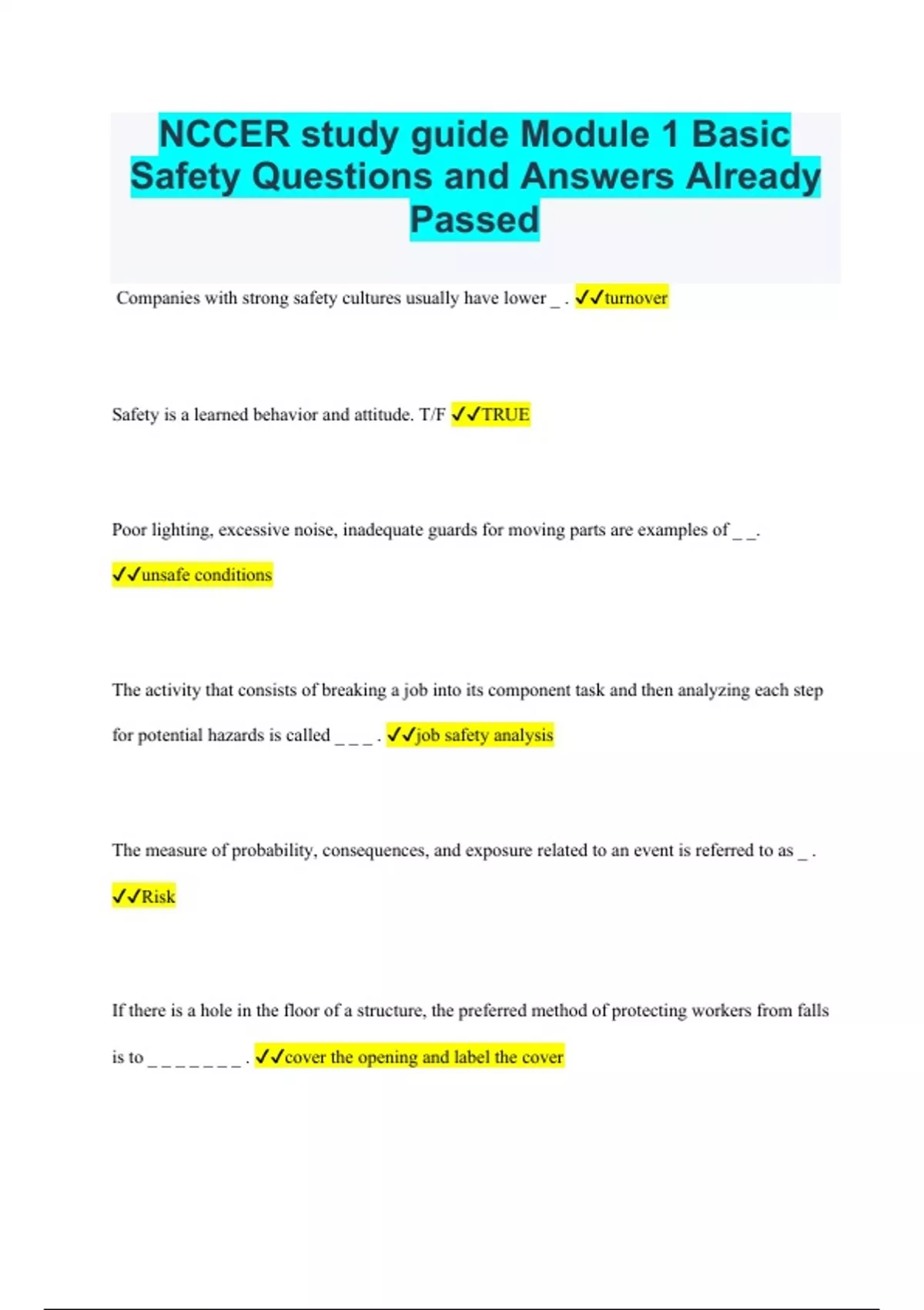 NCCER study guide Module 1 Basic Safety Questions and Answers Already Passed. Companies with strong safety cultures usually have lower _ . turnover Safety is a learned behavior and attitude. T/F TRUE Poor lighting, excessive noise, inadequate guards for moving parts are examples of _ _. unsafe conditions The activity that consists of breaking a job into its component task and then analyzing each step for potential hazards is called _ _ _ . job safety analysis The measure of probability, consequences, and exposure related to an event is referred to as _ . Risk If there is a hole in the floor of a structure, the preferred method of protecting workers from falls is to _ _ _ _ _ _ _ . cover the opening and label the cover