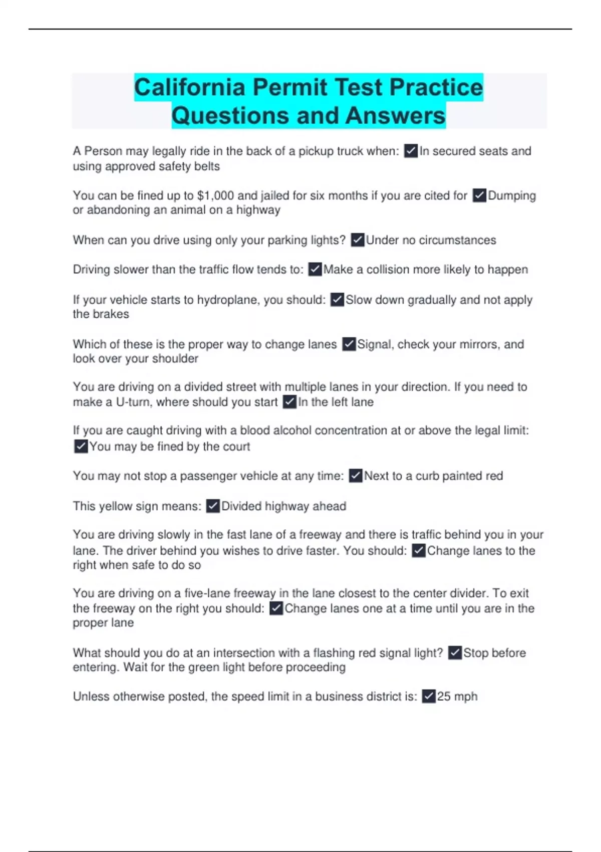 California Permit Test Practice Questions and Answers