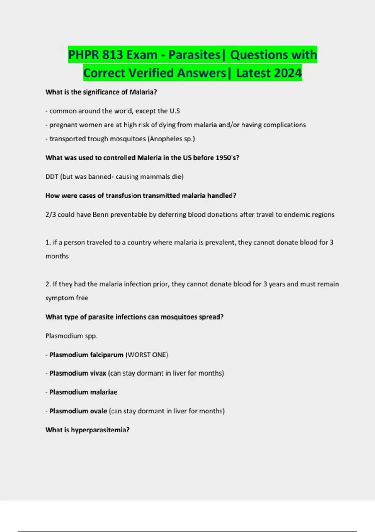 PHPR 813 Exam - Parasites| Questions with Correct Verified Answers| Latest 2024