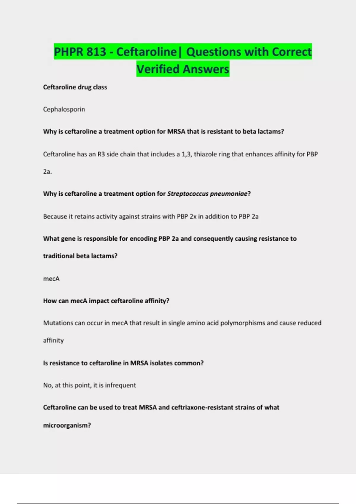 PHPR 813 - Ceftaroline| Questions with Correct Verified Answers