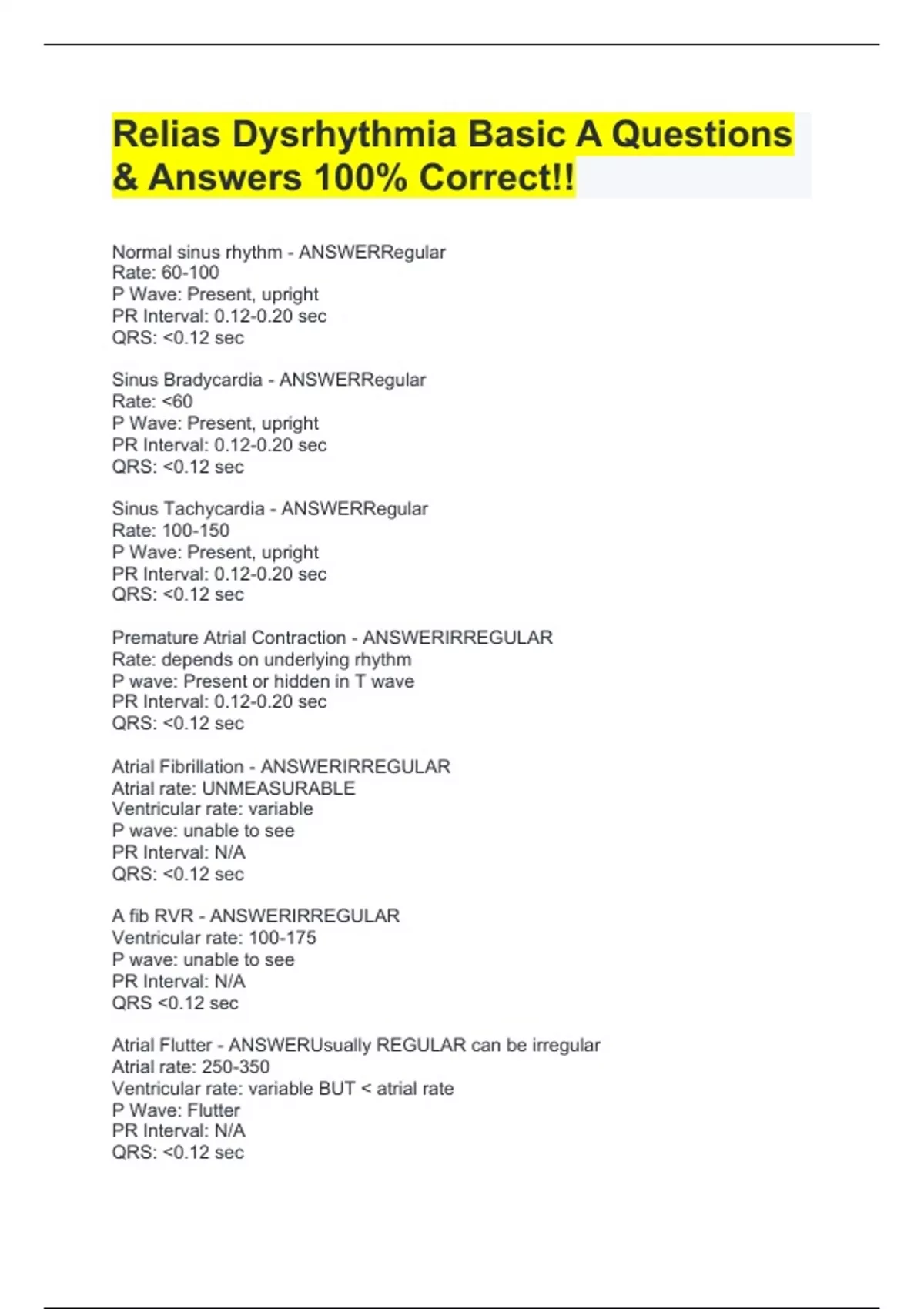 Normal sinus rhythm - ANSWERRegular Rate: 60-100 P Wave: Present, upright PR Interval: 0.12-0.20 sec QRS: <0.12 sec Sinus Bradycardia - ANSWERRegular Rate: <60 P Wave: Present, upright PR Interval: 0.12-0.20 sec QRS: <0.12 sec Sinus Tachycardia - ANSWERRegular Rate: 100-150 P Wave: Present, upright PR Interval: 0.12-0.20 sec QRS: <0.12 sec Premature Atrial Contraction - ANSWERIRREGULAR Rate: depends on underlying rhythm P wave: Present or hidden in T wave PR Interval: 0.12-0.20 sec QRS: <0.12 sec Atrial Fibrillation - ANSWERIRREGULAR Atrial rate: UNMEASURABLE Ventricular rate: variable P wave: unable to see PR Interval: N/A QRS: <0.12 sec A fib RVR - ANSWERIRREGULAR Ventricular rate: 100-175 P wave: unable to see PR Interval: N/A QRS <0.12 sec Atrial Flutter - ANSWERUsually REGULAR can be irregular Atrial rate: 250-350 Ventricular rate: variable BUT < atrial rate P Wave: Flutter PR Interval: N/A QRS: <0.12 sec
