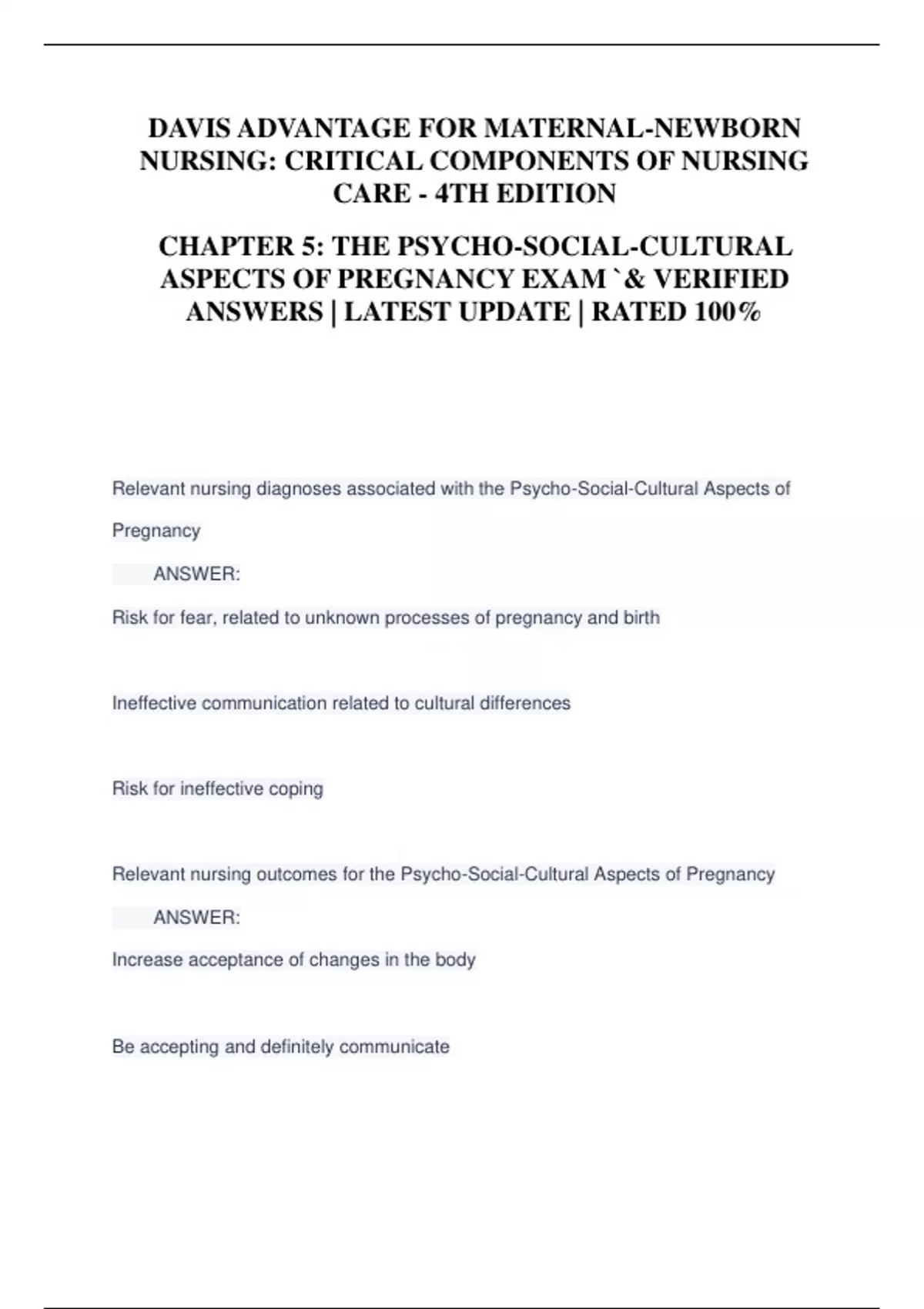 DAVIS ADVANTAGE FOR MATERNAL-NEWBORN NURSING: CRITICAL COMPONENTS OF NURSING CARE - 4TH EDITION CHAPTER 5: THE PSYCHO-SOCIAL-CULTURAL ASPECTS OF PREGNANCY EXAM `& VERIFIED ANSWERS | LATEST UPDATE | RATED 100%