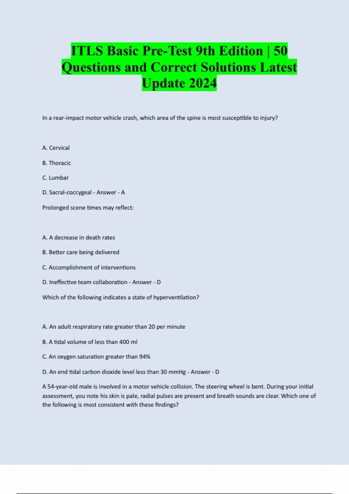 ITLS Basic Pre-Test 9th Edition | 50 Questions and Correct Solutions Latest Update 2024 In a rear-impact motor vehicle crash, which area of the spine is most susceptible to injury? A. Cervical B. Thoracic C. Lumbar D. Sacral-coccygeal - Answer - A Prolonged scene times may reflect: A. A decrease in death rates B. Better care being delivered C. Accomplishment of interventions D. Ineffective team collaboration - Answer - D Which of the following indicates a state of hyperventilation? A. An adult respiratory rate greater than 20 per minute B. A tidal volume of less than 400 ml C. An oxygen saturation greater than 94% D. An end tidal carbon dioxide level less than 30 mmHg - Answer - D A 54-year-old male is involved in a motor vehicle collision. The steering wheel is bent. During your initial assessment, you note his skin is pale, radial puls
