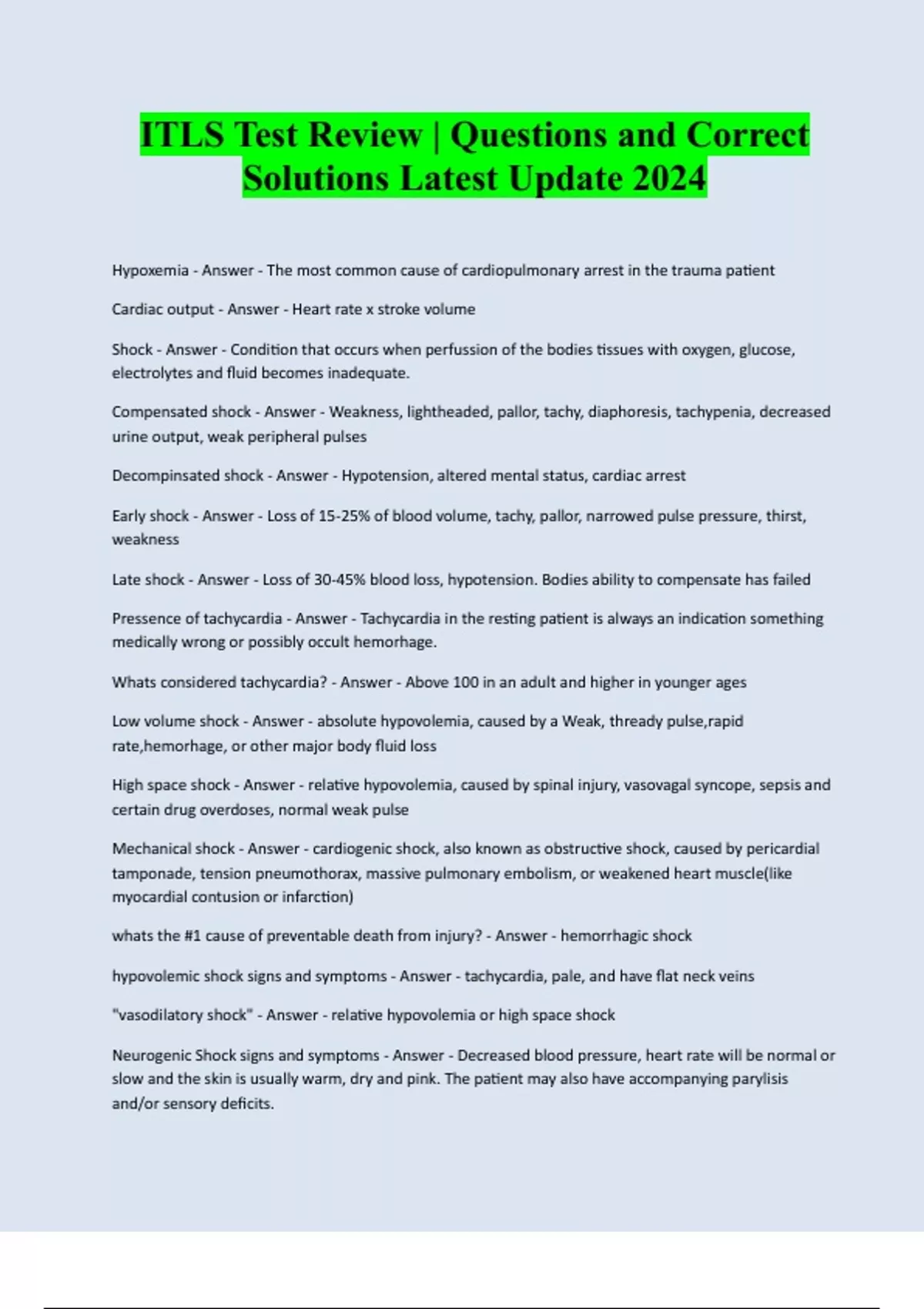ITLS Test Review | Questions and Correct Solutions Latest Update 2024 Hypoxemia - Answer - The most common cause of cardiopulmonary arrest in the trauma patient Cardiac output - Answer - Heart rate x stroke volume Shock - Answer - Condition that occurs when perfussion of the bodies tissues with oxygen, glucose, electrolytes and fluid becomes inadequate. Compensated shock - Answer - Weakness, lightheaded, pallor, tachy, diaphoresis, tachypenia, decreased urine output, weak peripheral pulses Decompinsated shock - Answer - Hypotension, altered mental status, cardiac arrest Early shock - Answer - Loss of 15-25% of blood volume, tachy, pallor, narrowed pulse pressure, thirst, weakness Late shock - Answer - Loss of 30-45% blood loss, hypotension. Bodies ability to compensate has failed Pressence of tachycardia - Answer - Tachycardia in the resting patient is always an indication something medically wrong or possibly occult hemorhage. Whats considered tachycardia? - Answer - Above 100 in an adult and higher in younger ages Low volume shock - Answer - absolute hypovolemia, caused by a Weak, thready pulse,rapid rate,hemorhage, or other major body fluid loss High space shock - Answer - relative hypovolemia, caused by spinal injury, vasovagal syncope, sepsis and certain drug overdoses, normal weak pulse Mechanical shock - Answer - cardiogenic shock, also known as obstructive shock, caused by pericardia