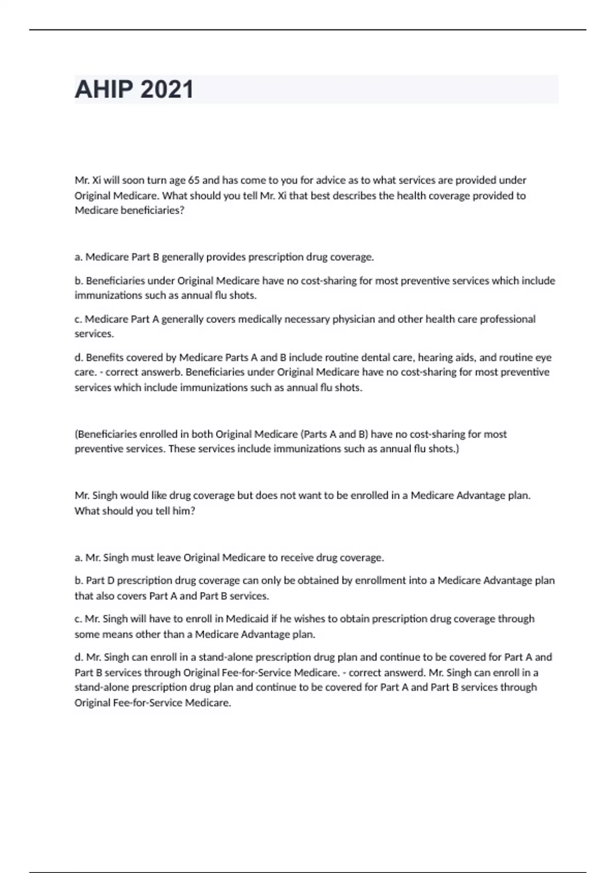 Mr. Xi will soon turn age 65 and has come to you for advice as to what services are provided under Original Medicare. What should you tell Mr. Xi that best describes the health coverage provided to Medicare beneficiaries? a. Medicare Part B generally provides prescription drug coverage. b. Beneficiaries under Original Medicare have no cost-sharing for most preventive services which include immunizations such as annual flu shots. c. Medicare Part A generally covers medically necessary physician and other health care professional services. d. Benefits covered by Medicare Parts A and B include routine dental care, hearing aids, and routine eye care. - correct answerb. Beneficiaries under Original Medicare have no cost-sharing for most preventive services which include immunizations such as annual flu shots. (Beneficiaries enrolled in both Original Medicare (Parts A and B) have no cost-sharing for most preventive services. These services include immunizations such as annual flu shots.) Mr. Singh would like drug coverage but does not want to be enrolled in a Medicare Advantage plan. What should you tell him? a. Mr. Singh must leave Original Medicare to receive drug coverage. b. Part D prescription drug coverage can only be obtained by enrollment into a Medicare Advantage plan that also covers Part A and Part B services. c. Mr. Singh will have to enroll in Medicaid if he wishes to obtain prescription drug coverage through some means other than a Medicare Advantage plan. d. Mr. Singh can enroll in a stand-alone prescription drug plan and continue to be covered for Part A and Part B services through Original Fee-for-Service Medicare. - correct answerd. Mr. Singh can enroll in a stand-alone prescription drug plan and continue to be covered for Part A and Part B services through Original Fee-for-Service Medicare.