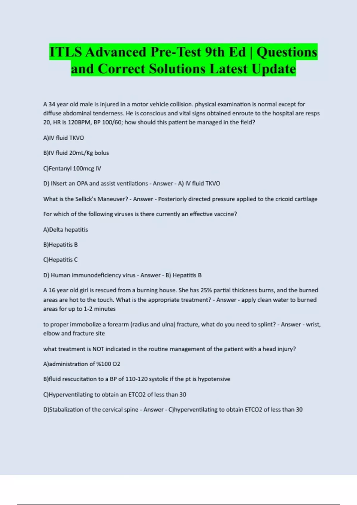 ITLS Advanced Pre-Test 9th Ed | Questions and Correct Solutions Latest Update A 34 year old male is injured in a motor vehicle collision. physical examination is normal except for diffuse abdominal tenderness. He is conscious and vital signs obtained enroute to the hospital are resps 20, HR is 120BPM, BP 100/60; how should this patient be managed in the field? A)IV fluid TKVO B)IV fluid 20mL/Kg bolus C)Fentanyl 100mcg IV D) INsert an OPA and assist ventilations - Answer - A) IV fluid TKVO What is the Sellick's Maneuver? - Answer - Posteriorly directed pressure applied to the cricoid cartilage For which of the following viruses is there currently an effective vaccine? A)Delta hepatitis B)Hepatitis B C)Hepatitis C D) Human immunodeficiency virus - Answer - B) Hepatitis B A 16 year old girl is rescued from a burning house. She has 25% partial thickness burns, and the burned areas are hot to the touch. What is the appropriate treatment? - Answer - apply clean water to burned areas for up to 1-2 minutes to proper immobolize a forearm (radius and ulna) fracture, what do you need to splint? - Answer - wrist, elbow and fracture site what treatment is NOT indicated in the routine management of the patient with a head injury? A)administration of %100 O2 B)fluid rescucitation to a BP of 110-120 systolic if the pt is hypotensiv