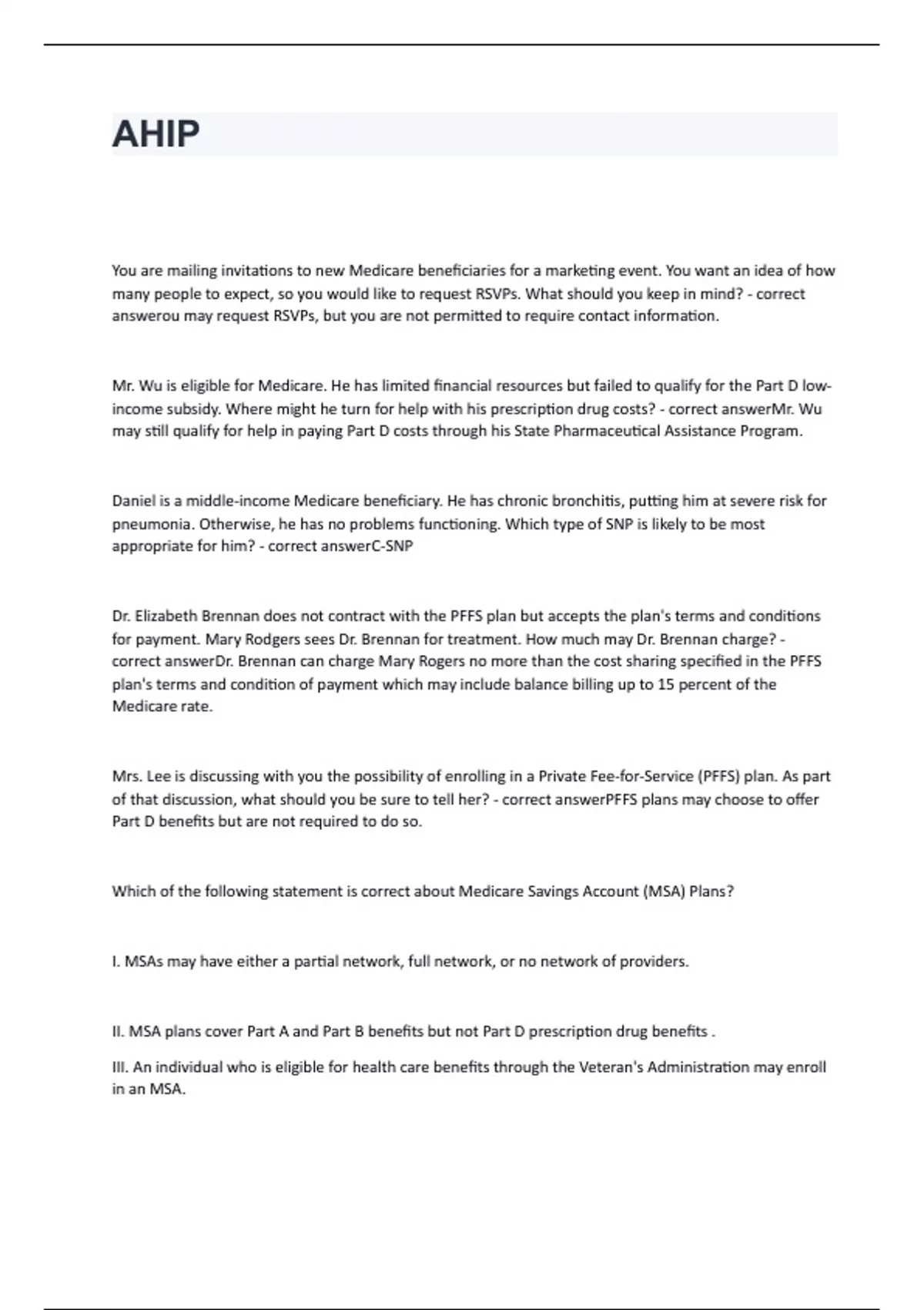You are mailing invitations to new Medicare beneficiaries for a marketing event. You want an idea of how many people to expect, so you would like to request RSVPs. What should you keep in mind? - correct answerou may request RSVPs, but you are not permitted to require contact information. Mr. Wu is eligible for Medicare. He has limited financial resources but failed to qualify for the Part D low-income subsidy. Where might he turn for help with his prescription drug costs? - correct answerMr. Wu may still qualify for help in paying Part D costs through his State Pharmaceutical Assistance Program. Daniel is a middle-income Medicare beneficiary. He has chronic bronchitis, putting him at severe risk for pneumonia. Otherwise, he has no problems functioning. Which type of SNP is likely to be most appropriate for him? - correct answerC-SNP Dr. Elizabeth Brennan does not contract with the PFFS plan but accepts the plan's terms and conditions for payment. Mary Rodgers sees Dr. Brennan for treatment. How much may Dr. Brennan charge? - correct answerDr. Brennan can charge Mary Rogers no more than the cost sharing specified in the PFFS plan's terms and condition of payment which may include balance billing up to 15 percent of the Medicare rate. Mrs. Lee is discussing with you the possibility of enrolling in a Private Fee-for-Service (PFFS) plan. As part of that discussion, what should you be sure to tell her? - correct answerPFFS plans may choose to offer Part D benefits but are not required to do so. Which of the following statement is correct about Medicare Savings Account (MSA) Plans? I. MSAs may have either a partial network, full network, or no network of providers. II. MSA plans cover Part A and Part B benefits but not Part D prescription drug benefits . III. An individual who is eligible for health care benefits through the Veteran's Administration may enroll in an MSA.