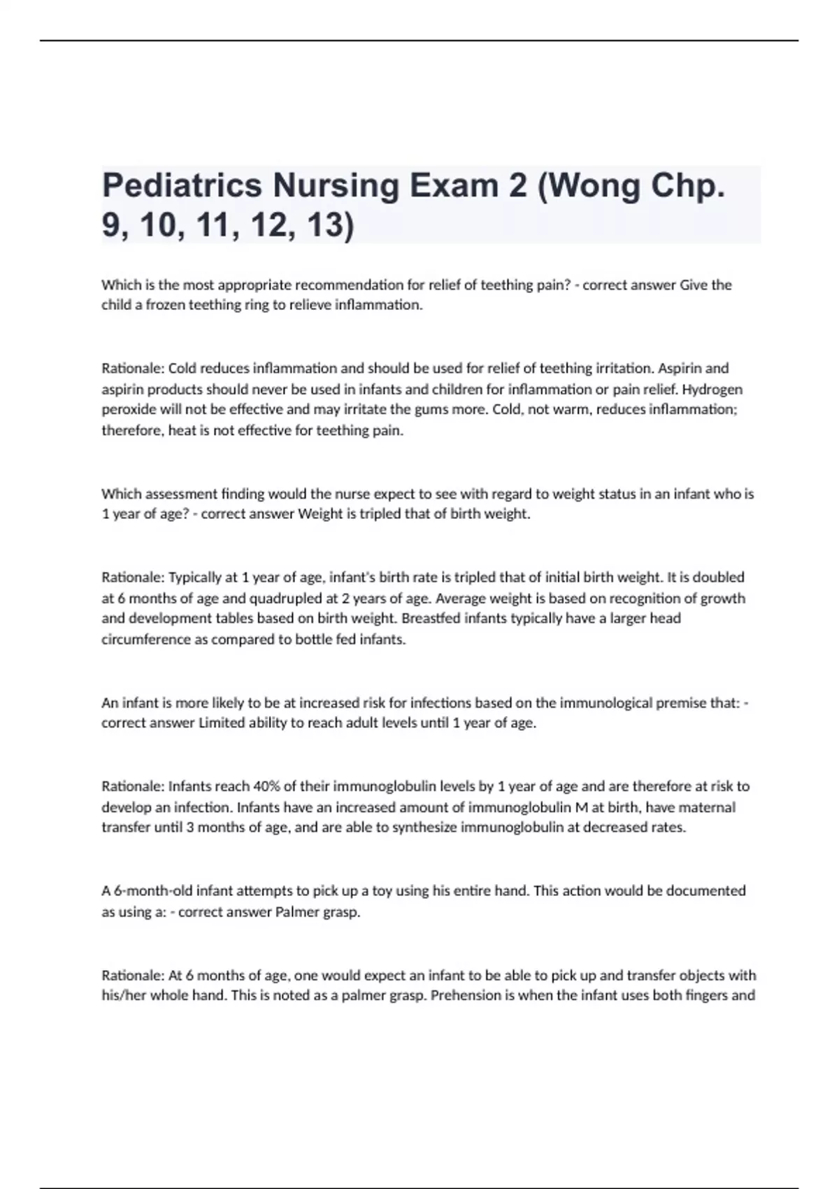 Which is the most appropriate recommendation for relief of teething pain? - correct answer Give the child a frozen teething ring to relieve inflammation. Rationale: Cold reduces inflammation and should be used for relief of teething irritation. Aspirin and aspirin products should never be used in infants and children for inflammation or pain relief. Hydrogen peroxide will not be effective and may irritate the gums more. Cold, not warm, reduces inflammation; therefore, heat is not effective for teething pain. Which assessment finding would the nurse expect to see with regard to weight status in an infant who is 1 year of age? - correct answer Weight is tripled that of birth weight. Rationale: Typically at 1 year of age, infant's birth rate is tripled that of initial birth weight. It is doubled at 6 months of age and quadrupled at 2 years of age. Average weight is based on recognition of growth and development tables based on birth weight. Breastfed infants typically have a larger head circumference as compared to bottle fed infants. An infant is more likely to be at increased risk for infections based on the immunological premise that: - correct answer Limited ability to reach adult levels until 1 year of age. Rationale: Infants reach 40% of their immunoglobulin levels by 1 year of age and are therefore at risk to develop an infection. Infants have an increased amount of immunoglobulin M at birth, have maternal transfer until 3 months of age, and are able to synthesize immunoglobulin at decreased rates. A 6-month-old infant attempts to pick up a toy using his entire hand. This action would be documented as using a: - correct answer Palmer grasp. Rationale: At 6 months of age, one would expect an infant to be able to pick up and transfer objects with his/her whole hand. This is noted as a palmer grasp. Prehension is when the infant uses both fingers and