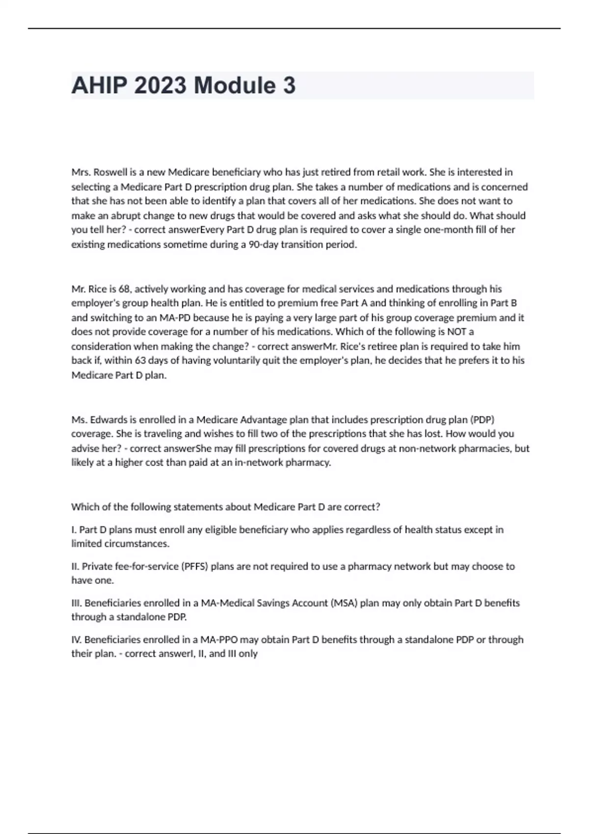 Mrs. Roswell is a new Medicare beneficiary who has just retired from retail work. She is interested in selecting a Medicare Part D prescription drug plan. She takes a number of medications and is concerned that she has not been able to identify a plan that covers all of her medications. She does not want to make an abrupt change to new drugs that would be covered and asks what she should do. What should you tell her? - correct answerEvery Part D drug plan is required to cover a single one-month fill of her existing medications sometime during a 90-day transition period. Mr. Rice is 68, actively working and has coverage for medical services and medications through his employer's group health plan. He is entitled to premium free Part A and thinking of enrolling in Part B and switching to an MA-PD because he is paying a very large part of his group coverage premium and it does not provide coverage for a number of his medications. Which of the following is NOT a consideration when making the change? - correct answerMr. Rice's retiree plan is required to take him back if, within 63 days of having voluntarily quit the employer's plan, he decides that he prefers it to his Medicare Part D plan. Ms. Edwards is enrolled in a Medicare Advantage plan that includes prescription drug plan (PDP) coverage. She is traveling and wishes to fill two of the prescriptions that she has lost. How would you advise her? - correct answerShe may fill prescriptions for covered drugs at non-network pharmacies, but likely at a higher cost than paid at an in-network pharmacy. Which of the following statements about Medicare Part D are correct? I. Part D plans must enroll any eligible beneficiary who applies regardless of health status except in limited circumstances. II. Private fee-for-service (PFFS) plans are not required to use a pharmacy network but may choose to have one. III. Beneficiaries enrolled in a MA-Medical Savings Account (MSA) plan may only obtain Part D benefits through a standalone PDP. IV. Beneficiaries enrolled in a MA-PPO may obtain Part D benefits through a standalone PDP or through their plan. - correct answerI, II, and III only