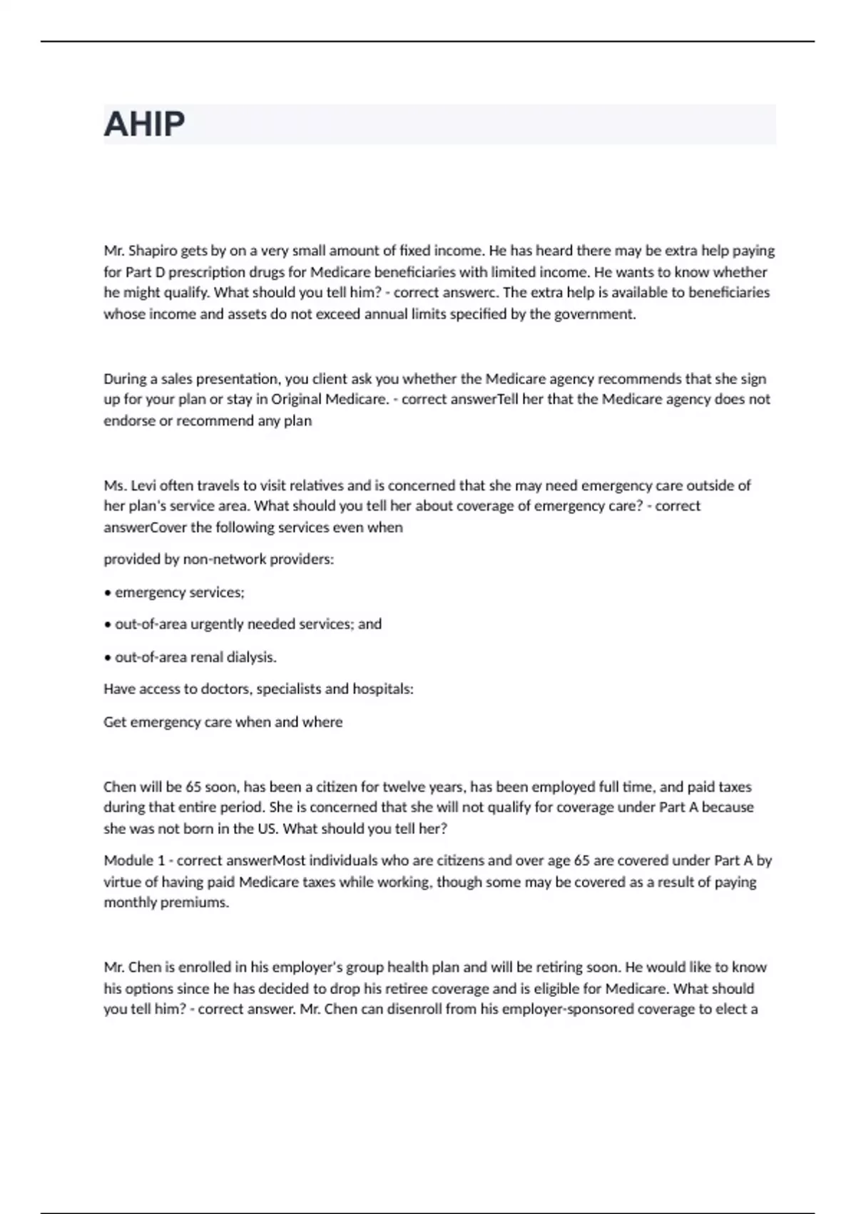 Mr. Shapiro gets by on a very small amount of fixed income. He has heard there may be extra help paying for Part D prescription drugs for Medicare beneficiaries with limited income. He wants to know whether he might qualify. What should you tell him? - correct answerc. The extra help is available to beneficiaries whose income and assets do not exceed annual limits specified by the government. During a sales presentation, you client ask you whether the Medicare agency recommends that she sign up for your plan or stay in Original Medicare. - correct answerTell her that the Medicare agency does not endorse or recommend any plan Ms. Levi often travels to visit relatives and is concerned that she may need emergency care outside of her plan's service area. What should you tell her about coverage of emergency care? - correct answerCover the following services even when provided by non-network providers: • emergency services; • out-of-area urgently needed services; and • out-of-area renal dialysis. Have access to doctors, specialists and hospitals: Get emergency care when and where Chen will be 65 soon, has been a citizen for twelve years, has been employed full time, and paid taxes during that entire period. She is concerned that she will not qualify for coverage under Part A because she was not born in the US. What should you tell her? Module 1 - correct answerMost individuals who are citizens and over age 65 are covered under Part A by virtue of having paid Medicare taxes while working, though some may be covered as a result of paying monthly premiums. Mr. Chen is enrolled in his employer's group health plan and will be retiring soon. He would like to know his options since he has decided to drop his retiree coverage and is eligible for Medicare. What should you tell him? - correct answer. Mr. Chen can disenroll from his employer-sponsored coverage to elect a