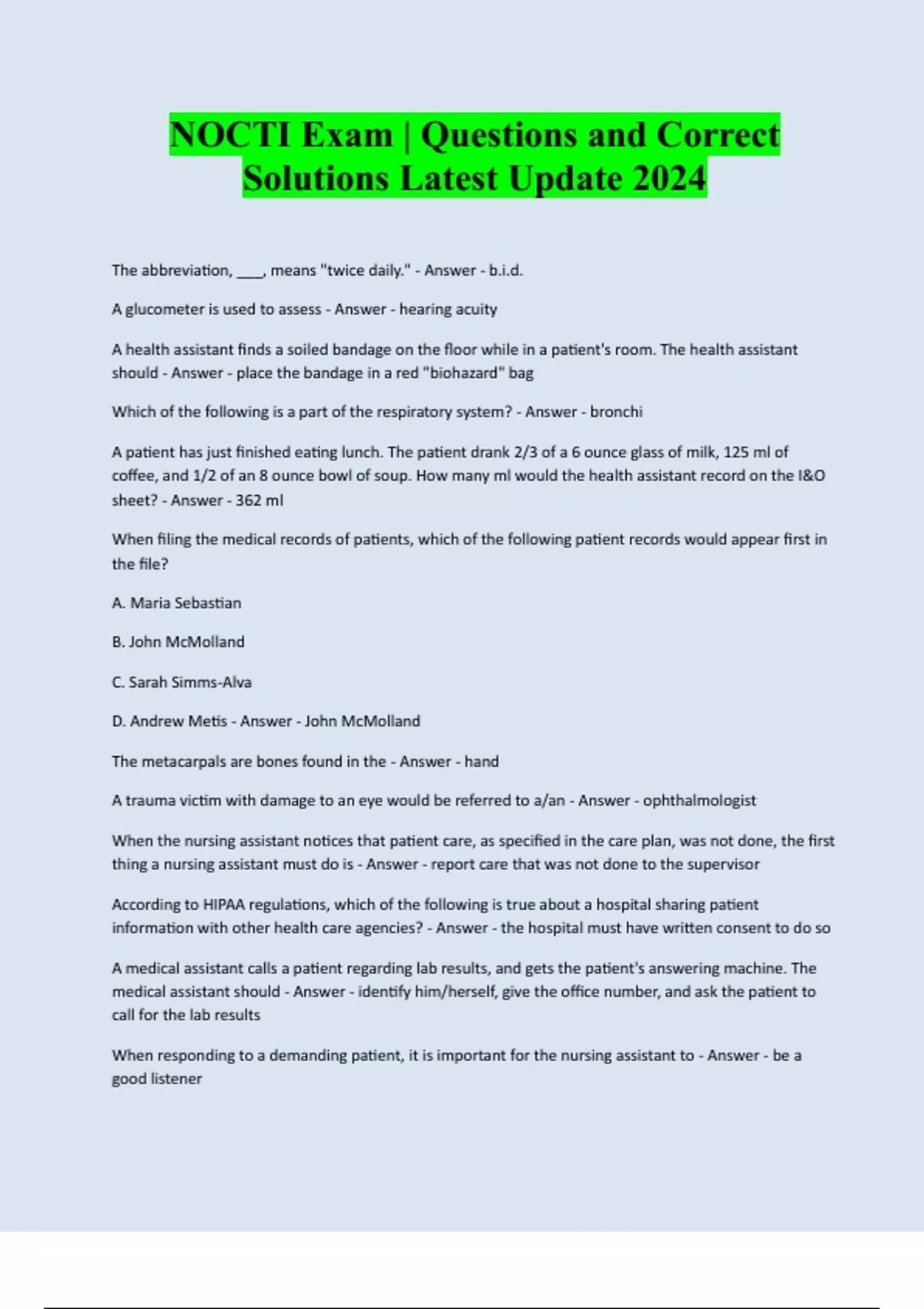 NOCTI Exam | Questions and Correct Solutions Latest Update 2024 The abbreviation, ___, means "twice daily." - Answer - b.i.d. A glucometer is used to assess - Answer - hearing acuity A health assistant finds a soiled bandage on the floor while in a patient's room. The health assistant should - Answer - place the bandage in a red "biohazard" bag Which of the following is a part of the respiratory system? - Answer - bronchi A patient has just finished eating lunch. The patient drank 2/3 of a 6 ounce glass of milk, 125 ml of coffee, and 1/2 of an 8 ounce bowl of soup. How many ml would the health assistant record on the I&O sheet? - Answer - 362 ml When filing the medical records of patients, which of the following patient records would appear first in the file? A. Maria Sebastian B. John McMolland C. Sarah Simms-Alva D. Andrew Metis - Answer - John McMolland The metacarpals are bones found in the - Answer - hand A trauma victim with damage to an eye would be referred to a/an - Answer - ophthalmologist When the nursing assistant notices that patient care, as specified in the care plan, was not done, the first thing a nursing assistant must do is - Answer - report care that was not done to the supervisor According to HIPAA regulations, which of the following is true about a hospital sharing patient information with other health care agencies? - Answer - the hospital must have written consent to do so A medical assistant calls a patient regarding lab results, and gets the patient's answering machine. The medical assistant should - Answer - identify him/herself, give the office number, and ask the patient to call for the lab results When responding to a demanding patient, it is important for the nursing assistant to - Answer - be a good listenerAn example of nonverbal communication is - Answer - nodding Sara wants to collect data on the number of cases of influenza per month for a year in order to compare the average number of cases for each month. She wants to be able to sort the data and prepare a graph of the data. Which of the following types of software will best meet her needs? - Answer - spreadsheet The local hospital wants to send a prsonalized letter to each person from their database that completed a follow-up survey. To do this, the hospital should use - Answer - mail-mrge When a patient learns facts about a new treatment, incl