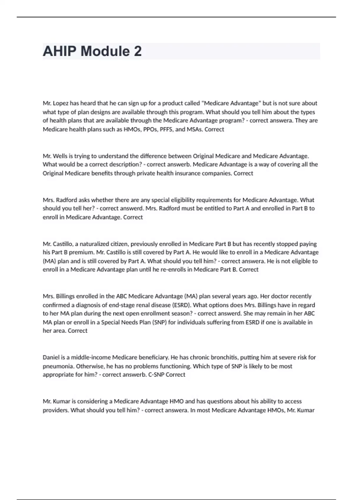 Mr. Lopez has heard that he can sign up for a product called "Medicare Advantage" but is not sure about what type of plan designs are available through this program. What should you tell him about the types of health plans that are available through the Medicare Advantage program? - correct answera. They are Medicare health plans such as HMOs, PPOs, PFFS, and MSAs. Correct Mr. Wells is trying to understand the difference between Original Medicare and Medicare Advantage. What would be a correct description? - correct answerb. Medicare Advantage is a way of covering all the Original Medicare benefits through private health insurance companies. Correct Mrs. Radford asks whether there are any special eligibility requirements for Medicare Advantage. What should you tell her? - correct answerd. Mrs. Radford must be entitled to Part A and enrolled in Part B to enroll in Medicare Advantage. Correct Mr. Castillo, a naturalized citizen, previously enrolled in Medicare Part B but has recently stopped paying his Part B premium. Mr. Castillo is still covered by Part A. He would like to enroll in a Medicare Advantage (MA) plan and is still covered by Part A. What should you tell him? - correct answera. He is not eligible to enroll in a Medicare Advantage plan until he re-enrolls in Medicare Part B. Correct Mrs. Billings enrolled in the ABC Medicare Advantage (MA) plan several years ago. Her doctor recently confirmed a diagnosis of end-stage renal disease (ESRD). What options does Mrs. Billings have in regard to her MA plan during the next open enrollment season? - correct answerd. She may remain in her ABC MA plan or enroll in a Special Needs Plan (SNP) for individuals suffering from ESRD if one is available in her area. Correct Daniel is a middle-income Medicare beneficiary. He has chronic bronchitis, putting him at severe risk for pneumonia. Otherwise, he has no problems functioning. Which type of SNP is likely to be most appropriate for him? - correct answerb. C-SNP Correct Mr. Kumar is considering a Medicare Advantage HMO and has questions about his ability to access providers. What should you tell him? - correct answera. In most Medicare Advantage HMOs, Mr. Kumar