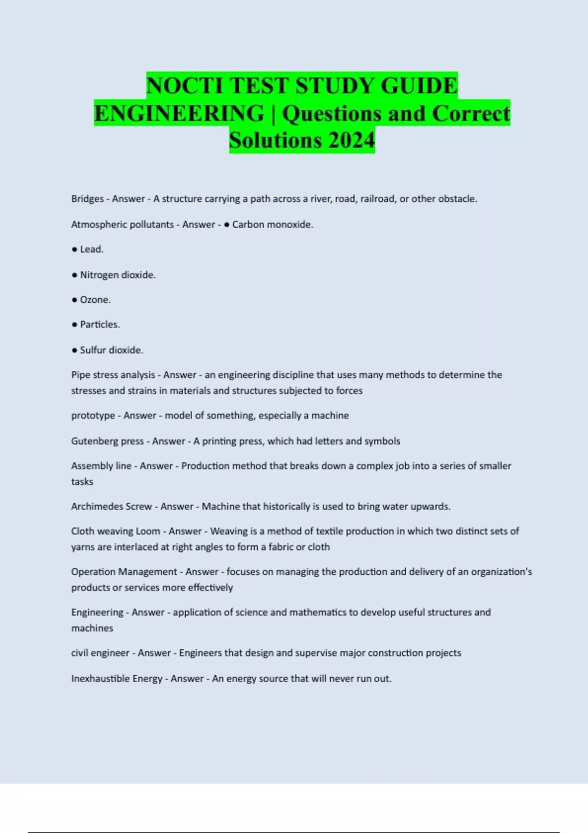 NOCTI TEST STUDY GUIDE ENGINEERING | Questions and Correct Solutions 2024 Bridges - Answer - A structure carrying a path across a river, road, railroad, or other obstacle. Atmospheric pollutants - Answer - ● Carbon monoxide. ● Lead. ● Nitrogen dioxide. ● Ozone. ● Particles. ● Sulfur dioxide. Pipe stress analysis - Answer - an engineering discipline that uses many methods to determine the stresses and strains in materials and structures subjected to forces prototype - Answer - model of something, especially a machine Gutenberg press - Answer - A printing press, which had letters and symbols Assembly line - Answer - Production method that breaks down a complex job into a series of smaller tasks Archimedes Screw - Answer - Machine that historically is used to bring water upwards. Cloth weaving Loom - Answer - Weaving is a method of textile production in which two distinct sets of yarns are interlaced at right angles to form a fabric or cloth Operation Management - Answer - focuses on managing the production and delivery of an organization's products or services more effectively Engineering - Answer - application of science and mathematics to develop useful structures and machines civil engineer - Answer - Engineers that design and supervise major construction projects Inexhaustible Energy - Answer - An energy source th