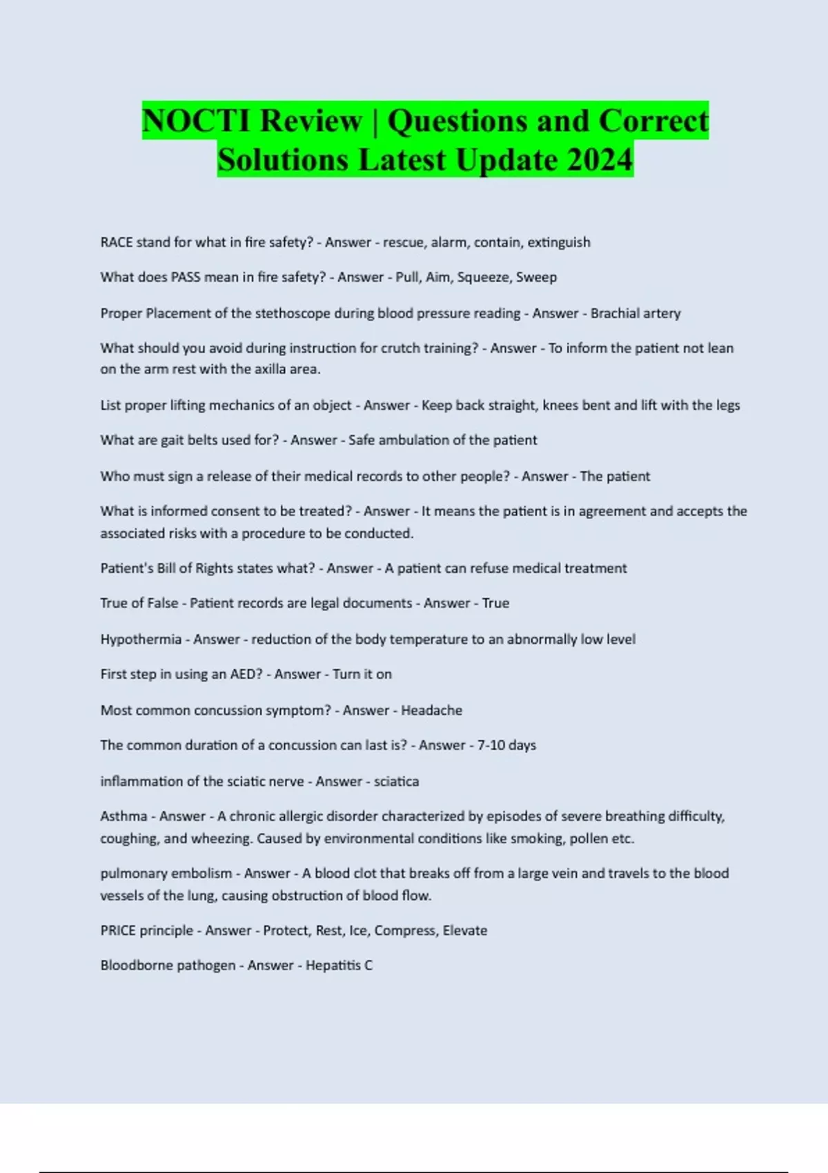 NOCTI Review | Questions and Correct Solutions Latest Update 2024 RACE stand for what in fire safety? - Answer - rescue, alarm, contain, extinguish What does PASS mean in fire safety? - Answer - Pull, Aim, Squeeze, Sweep Proper Placement of the stethoscope during blood pressure reading - Answer - Brachial artery What should you avoid during instruction for crutch training? - Answer - To inform the patient not lean on the arm rest with the axilla area. List proper lifting mechanics of an object - Answer - Keep back straight, knees bent and lift with the legs What are gait belts used for? - Answer - Safe ambulation of the patient Who must sign a release of their medical records to other people? - Answer - The patient What is informed consent to be treated? - Answer - It means the patient is in agreement and accepts the associated risks with a procedure to be conducted. Patient's Bill of Rights states what? - Answer - A patient can refuse medical treatment True of False - Patient records are legal documents - Answer - True Hypothermia - Answer - reduction of the body temperature to an abnormally low level First step in using an AED? - Answer - Turn it on Most common concussion symptom? - Answer - Headache The common duration of a concussion can last is? - Answer - 7-10 days inflammation of the sciatic nerve - Answer - sciatica Asthma - Answer - A chronic allergic disorder characterized by episodes of severe breathing difficulty, coughing, and wheezing. Caused by environmental conditions like smoking, pollen etc. pulmonary embolism - Answer - A blood clot that breaks off from a large vein and travels to the blood vessels of the lung, causing obstruction of blood flow. PRICE principle - Answer - Protect, Rest, Ice, Compress, Elevate Bloodborne pathogen - Answer - Hep