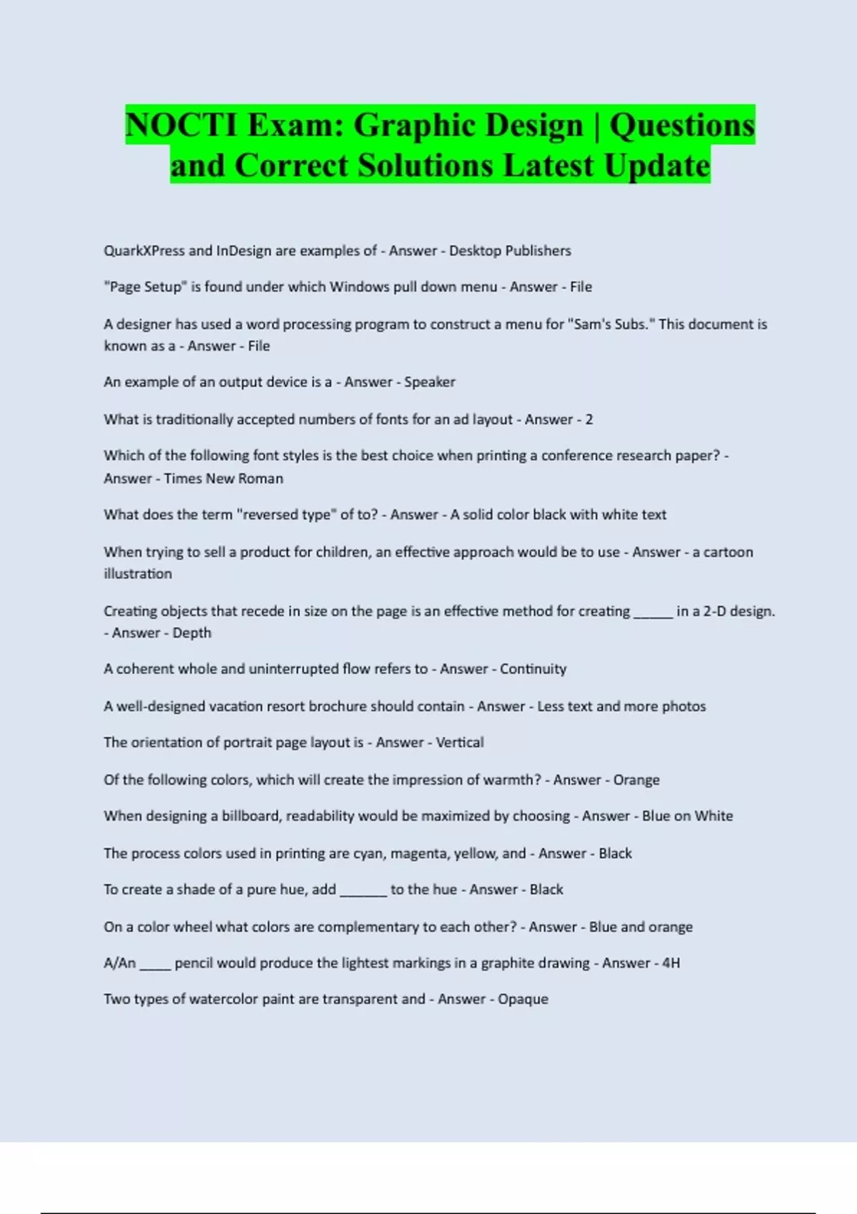 NOCTI Exam: Graphic Design | Questions and Correct Solutions Latest Update QuarkXPress and InDesign are examples of - Answer - Desktop Publishers "Page Setup" is found under which Windows pull down menu - Answer - File A designer has used a word processing program to construct a menu for "Sam's Subs." This document is known as a - Answer - File An example of an output device is a - Answer - Speaker What is traditionally accepted numbers of fonts for an ad layout - Answer - 2 Which of the following font styles is the best choice when printing a conference research paper? - Answer - Times New Roman What does the term "reversed type" of to? - Answer - A solid color black with white text When trying to sell a product for children, an effective approach would be to use - Answer - a cartoon illustration Creating objects that recede in size on the page is an effective method for creating _____ in a 2-D design. - Answer - Depth A coherent whole and uninterrupted flow refers to - Answer - Continuity A well-designed vacation resort brochure should contain - Answer - Less text and more photos The orientation of portrait page layout is - Answer - Vertical Of the following colors, which will create the impression of warmth? - Answer - Orange When designing a billboard, readability would be maximized by choosing - Answer - Blue on White The process colors used in printing are cyan, magenta, yellow, and - Answer - Black To create a shade of a pure hue, add ______ to the hue - Answer -