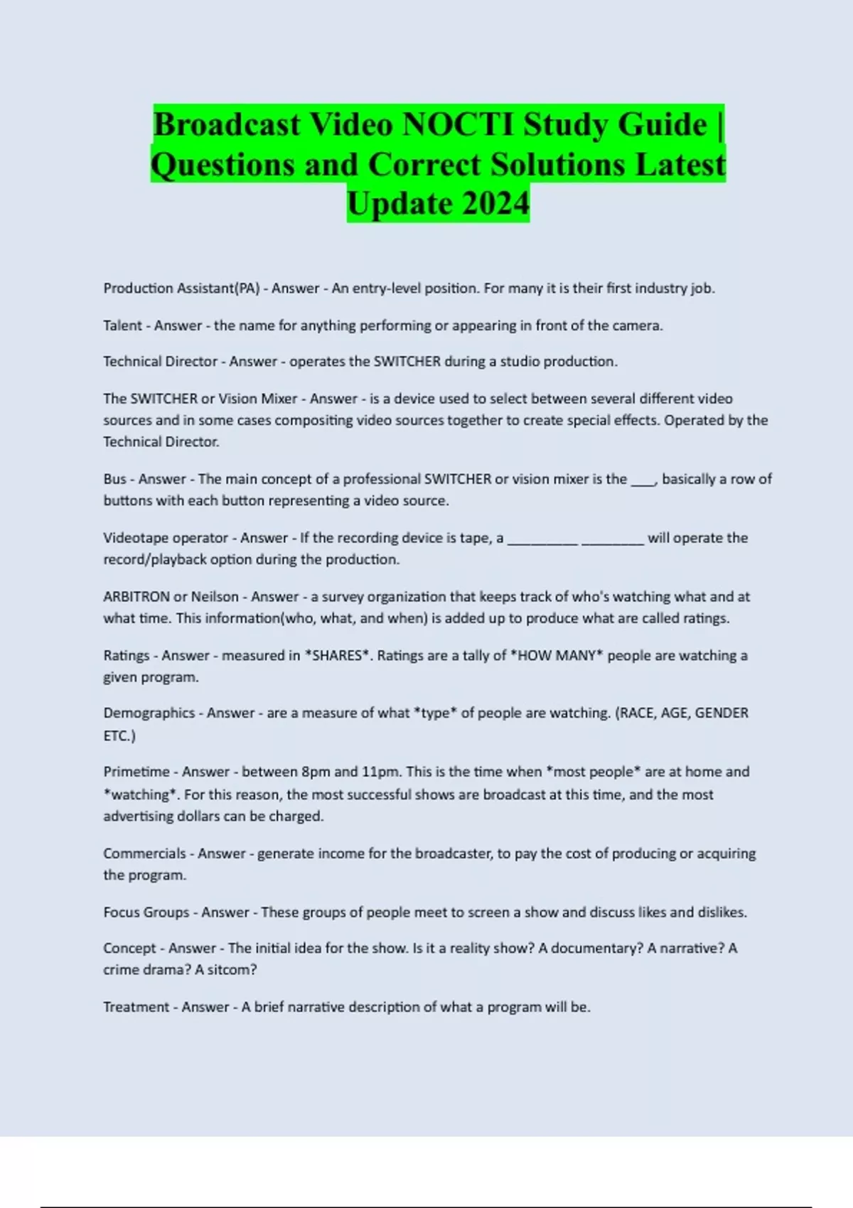 Broadcast Video NOCTI Study Guide | Questions and Correct Solutions Latest Update 2024 Production Assistant(PA) - Answer - An entry-level position. For many it is their first industry job. Talent - Answer - the name for anything performing or appearing in front of the camera. Technical Director - Answer - operates the SWITCHER during a studio production. The SWITCHER or Vision Mixer - Answer - is a device used to select between several different video sources and in some cases compositing video sources together to create special effects. Operated by the Technical Director. Bus - Answer - The main concept of a professional SWITCHER or vision mixer is the ___, basically a row of buttons with each button representing a video source. Videotape operator - Answer - If the recording device is tape, a _________ ________ will operate the record/playback option during the production. ARBITRON or Neilson - Answer - a survey organization that keeps track of who's watching what and at what time. This information(who, what, and when) is added up to produce what are called ratings. Ratings - Answer - measured in *SHARES*. Ratings are a tally of *HOW MANY* people are watching a given program. Demographics - Answer - are a measure of what *type* of people are watching. (RACE, AGE, GENDER ETC.) Primetime - Answer - between 8pm and 11pm. This is the time when *most people* are at home and *watching*. For this reason, the most successful shows are broadcast at this time, and the most advertising dollars can be charged. Commercials - Answer - generate income for the broadcaster, to pay the cost of producing or acquiring the program. Focus Groups - Answer - These groups of people meet to screen a show and discuss likes and dislikes. Concept - Answer - The initial idea for the show. Is it a reality show? A documentary? A narrative? A crime drama? A sitcom?