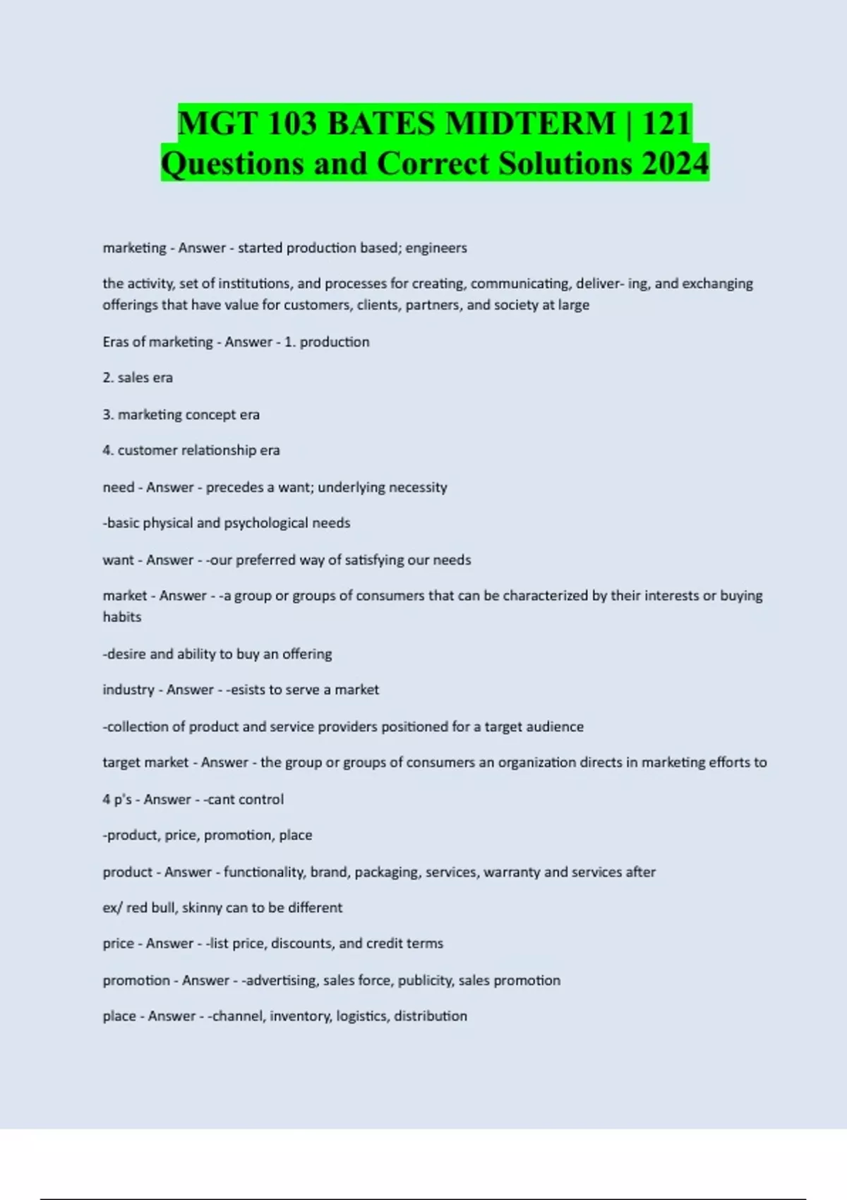 MGT 103 BATES MIDTERM | 121 Questions and Correct Solutions 2024 marketing - Answer - started production based; engineers the activity, set of institutions, and processes for creating, communicating, deliver- ing, and exchanging offerings that have value for customers, clients, partners, and society at large Eras of marketing - Answer - 1. production 2. sales era 3. marketing concept era 4. customer relationship era need - Answer - precedes a want; underlying necessity -basic physical and psychological needs want - Answer - -our preferred way of satisfying our needs market - Answer - -a group or groups of consumers that can be characterized by their interests or buying habits -desire and ability to buy an offering industry - Answer - -esists to serve a market -collection of product and service providers positioned for a target audience target market - Answer - the group or groups of consumers an organization directs in marketing efforts to 4 p's - Answer - -cant control -product, price, promotion, place product - Answer - functionality, brand, packaging, services, warranty and services after ex/ red bull, skinny can to be different price - Answer - -list price, discounts, and credit terms promotion - Answer - -advertising, sales force, publicity, sales promotion place - Answer - -channel, inventory, logistics, distributi