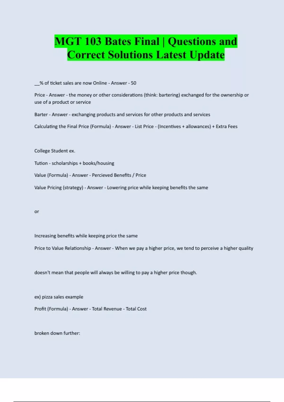 MGT 103 Bates Final | Questions and Correct Solutions Latest Update __% of ticket sales are now Online - Answer - 50 Price - Answer - the money or other considerations (think: bartering) exchanged for the ownership or use of a product or service Barter - Answer - exchanging products and services for other products and services Calculating the Final Price (Formula) - Answer - List Price - (Incentives + allowances) + Extra Fees College Student ex. Tution - scholarships + books/housing Value (Formula) - Answer - Percieved Benefits / Price Value Pricing (strategy) - Answer - Lowering price while keeping benefits the same or Increasing benefits while keeping price the same Price to Value Relationship - Answer - When we pay a higher price, we tend to perceive a higher quality doesn't mean that people will always be willing to pay a higher price though. ex) pizza sales example Profit (Formula) - Answer - Total Revenue - Total Cost broken down further: