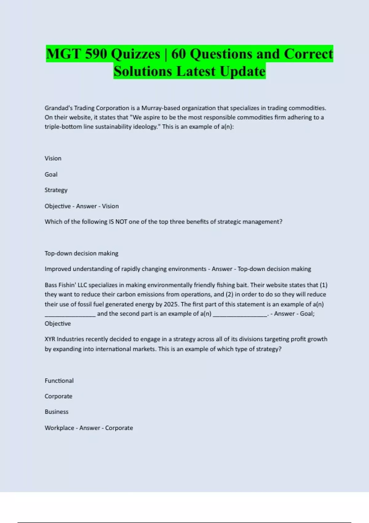 MGT 590 Quizzes | 60 Questions and Correct Solutions Latest Update Grandad's Trading Corporation is a Murray-based organization that specializes in trading commodities. On their website, it states that "We aspire to be the most responsible commodities firm adhering to a triple-bottom line sustainability ideology." This is an example of a(n): Vision Goal Strategy Objective - Answer - Vision Which of the following IS NOT one of the top three benefits of strategic management? Top-down decision making Improved understanding of rapidly changing environments - Answer - Top-down decision making Bass Fishin' LLC specializes in making environmentally friendly fishing bait. Their website states that (1) they want to reduce their carbon emissions from operations, and (2) in order to do so they will reduce their use of fossil fuel generated energy by 2025. The first part of this statement is an example of a(n) _______________ and the second part is an example of a(n) ________________. - Answer - Goal; Objective XYR Industries recently decided to engage in a strategy across all of its divisions targeting profit growth by expanding into international markets. This is an example of which type of strategy? Functional Corporate Business Workplace - Answer - CorporateA ______________ defines the fundamental, unique purpose that sets a company apart from other firms. Mission Visi