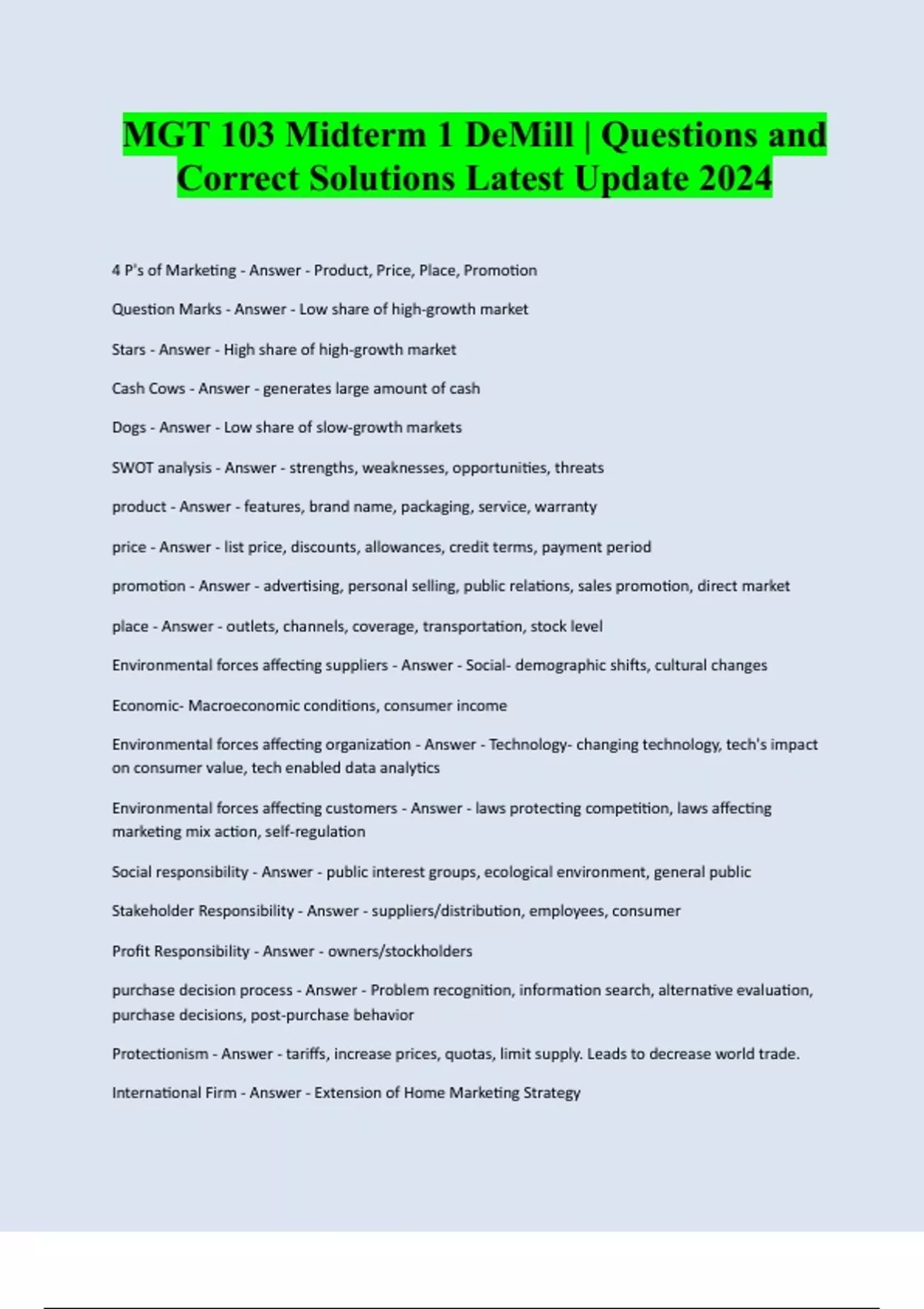 MGT 103 Midterm 1 DeMill | Questions and Correct Solutions Latest Update 2024 4 P's of Marketing - Answer - Product, Price, Place, Promotion Question Marks - Answer - Low share of high-growth market Stars - Answer - High share of high-growth market Cash Cows - Answer - generates large amount of cash Dogs - Answer - Low share of slow-growth markets SWOT analysis - Answer - strengths, weaknesses, opportunities, threats product - Answer - features, brand name, packaging, service, warranty price - Answer - list price, discounts, allowances, credit terms, payment period promotion - Answer - advertising, personal selling, public relations, sales promotion, direct market place - Answer - outlets, channels, coverage, transportation, stock level Environmental forces affecting suppliers - Answer - Social- demographic shifts, cultural changes Economic- Macroeconomic conditions, consumer income Environmental forces affecting organization - Answer - Technology- changing technology, tech's impact on consumer value, tech enabled data analytics Environmental forces affecting customers - Answer - laws protecting competition, laws affecting marketing mix action, self-regulation Social responsibility - Answer - public interest groups, ecological environment, general public Stakeholder Responsibility - Answer - suppliers/distribution, employees, consumer Profit Responsibility - Answer - owners/stockholders purchase decision process - Answer - Problem reco