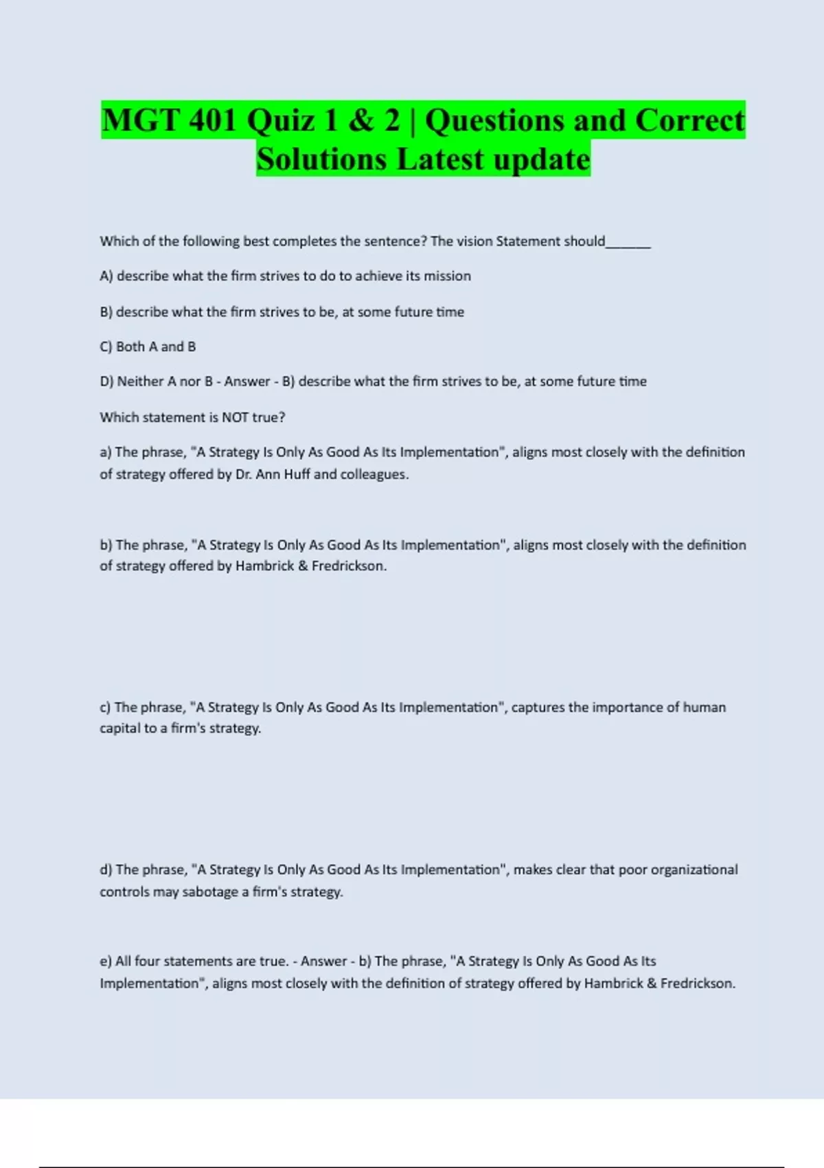 MGT 401 Quiz 1 & 2 | Questions and Correct Solutions Latest update Which of the following best completes the sentence? The vision Statement should______ A) describe what the firm strives to do to achieve its mission B) describe what the firm strives to be, at some future time C) Both A and B D) Neither A nor B - Answer - B) describe what the firm strives to be, at some future time Which statement is NOT true? a) The phrase, "A Strategy Is Only As Good As Its Implementation", aligns most closely with the definition of strategy offered by Dr. Ann Huff and colleagues. b) The phrase, "A Strategy Is Only As Good As Its Implementation", aligns most closely with the definition of strategy offered by Hambrick & Fredrickson. c) The phrase, "A Strategy Is Only As Good As Its Implementation", captures the importance of human capital to a firm's strategy. d) The phrase, "A Strategy Is Only As Good As Its Implementation", makes clear that poor organizational controls may sabotage a firm's strategy. e) All four statements are true. - Answer - b) The phrase, "A Strategy Is Only As Good As Its Implementation", aligns most closely with the defi