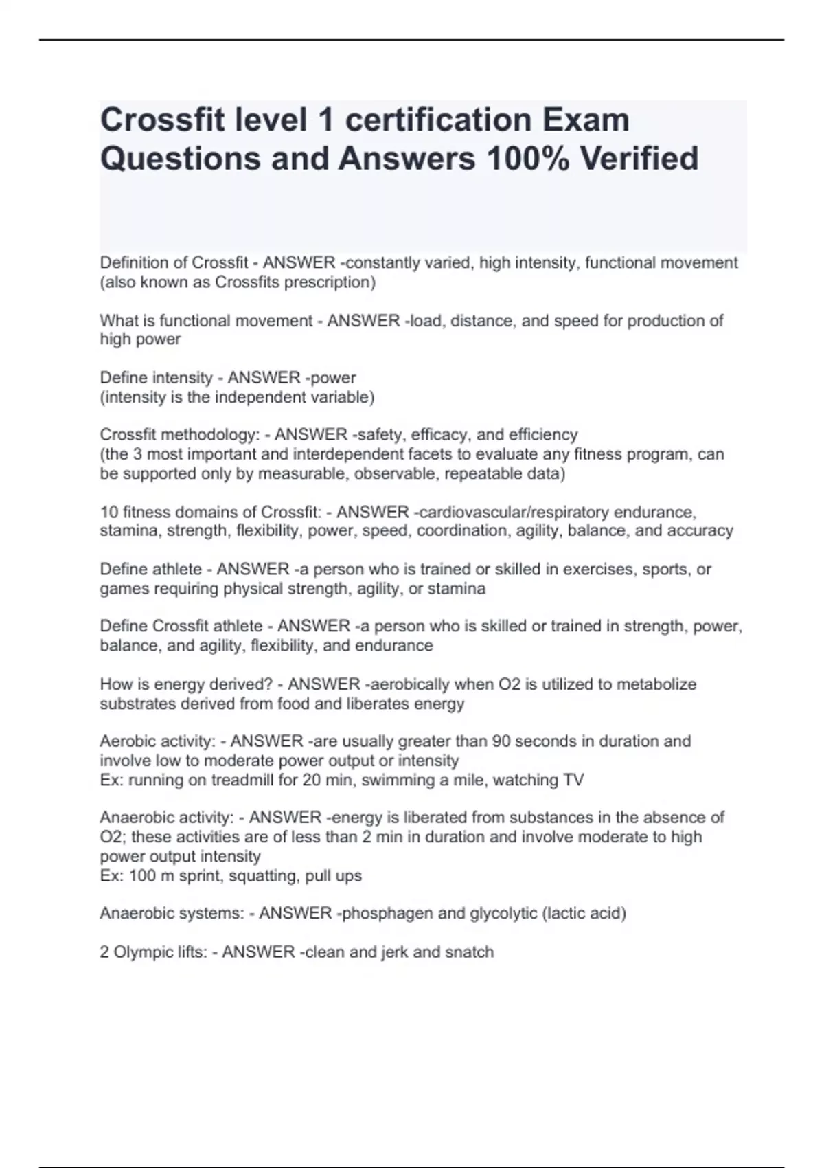 Definition of Crossfit - ANSWER -constantly varied, high intensity, functional movement (also known as Crossfits prescription) What is functional movement - ANSWER -load, distance, and speed for production of high power Define intensity - ANSWER -power (intensity is the independent variable) Crossfit methodology: - ANSWER -safety, efficacy, and efficiency (the 3 most important and interdependent facets to evaluate any fitness program, can be supported only by measurable, observable, repeatable data) 10 fitness domains of Crossfit: - ANSWER -cardiovascular/respiratory endurance, stamina, strength, flexibility, power, speed, coordination, agility, balance, and accuracy Define athlete - ANSWER -a person who is trained or skilled in exercises, sports, or games requiring physical strength, agility, or stamina Define Crossfit athlete - ANSWER -a person who is skilled or trained in strength, power, balance, and agility, flexibility, and endurance How is energy derived? - ANSWER -aerobically when O2 is utilized to metabolize substrates derived from food and liberates energy Aerobic activity: - ANSWER -are usually greater than 90 seconds in duration and involve low to moderate power output or intensity Ex: running on treadmill for 20 min, swimming a mile, watching TV Anaerobic activity: - ANSWER -energy is liberated from substances in the absence of O2; these activities are of less than 2 min in duration and involve moderate to high power output intensity Ex: 100 m sprint, squatting, pull ups Anaerobic systems: - ANSWER -phosphagen and glycolytic (lactic acid) 2 Olympic lifts: - ANSWER -clean and jerk and snatch