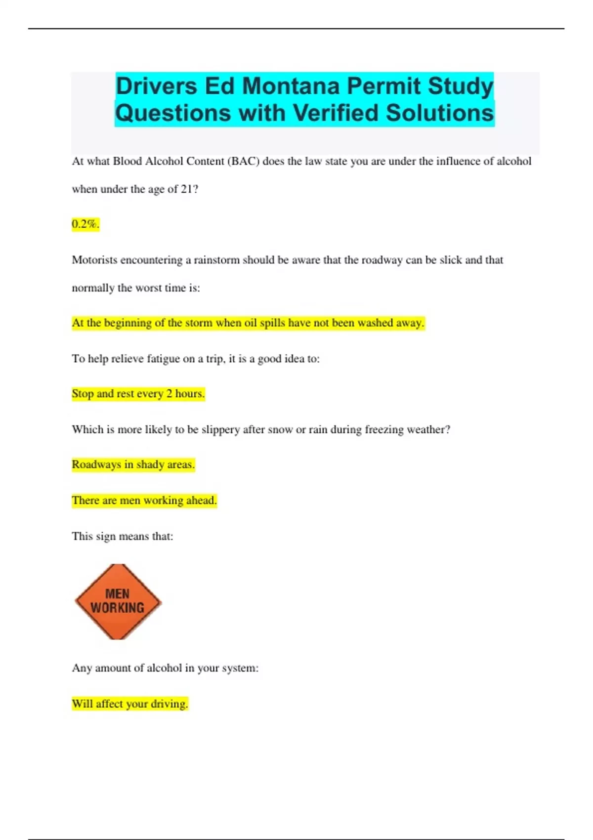 At what Blood Alcohol Content (BAC) does the law state you are under the influence of alcohol when under the age of 21? 0.2%. Motorists encountering a rainstorm should be aware that the roadway can be slick and that normally the worst time is: At the beginning of the storm when oil spills have not been washed away. To help relieve fatigue on a trip, it is a good idea to: Stop and rest every 2 hours. Which is more likely to be slippery after snow or rain during freezing weather? Roadways in shady areas. There are men working ahead. This sign means that: Any amount of alcohol in your system: Will affect your driving.Mandatory motor vehicle liability proof: Must be in effect in the vehicle being operated. There is a school bus stopping area ahead. This sig
