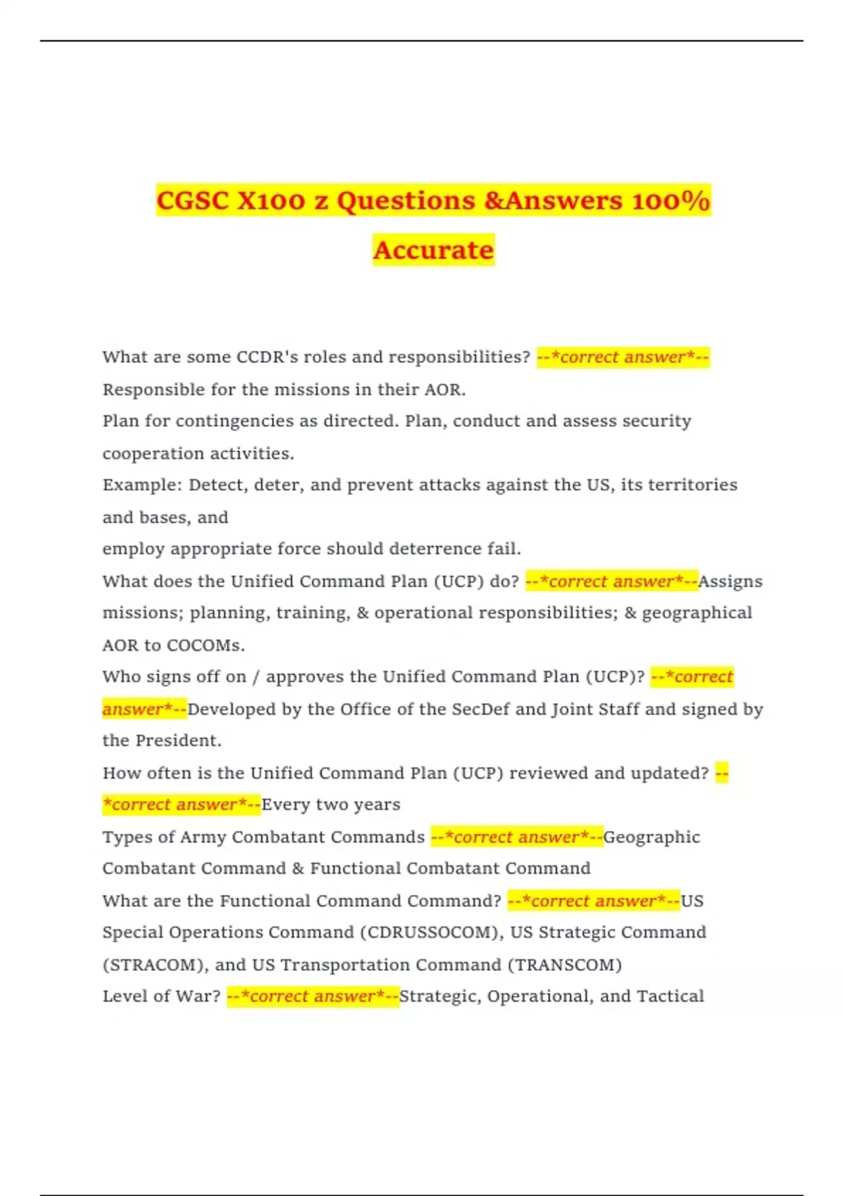 CGSC X100 z Questions &Answers 100% Accurate What are some CCDR's roles and responsibilities? --*correct answer*--Responsible for the missions in their AOR. Plan for contingencies as directed. Plan, conduct and assess security cooperation activities. Example: Detect, deter, and prevent attacks against the US, its territories and bases, and employ appropriate force should deterrence fail. What does the Unified Command Plan (UCP) do? --*correct answer*--Assigns missions; planning, training, & operational responsibilities; & geographical AOR to COCOMs.