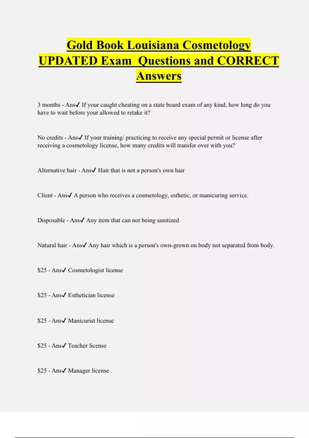 Gold Book Louisiana Cosmetology UPDATED Exam Questions and CORRECT Answers 3 months - Ans If your caught cheating on a state board exam of any kind, how long do you have to wait before your allowed to retake it? No credits - Ans If your training/ practicing to receive any special permit or license after receiving a cosmetology license, how many credits will transfer over with you? Alternative hair - Ans Hair that is not a person's own hair Client - Ans A person who receives a cosmetology, esthetic, or manicuring service. Disposable - Ans Any item that can not being sanitized