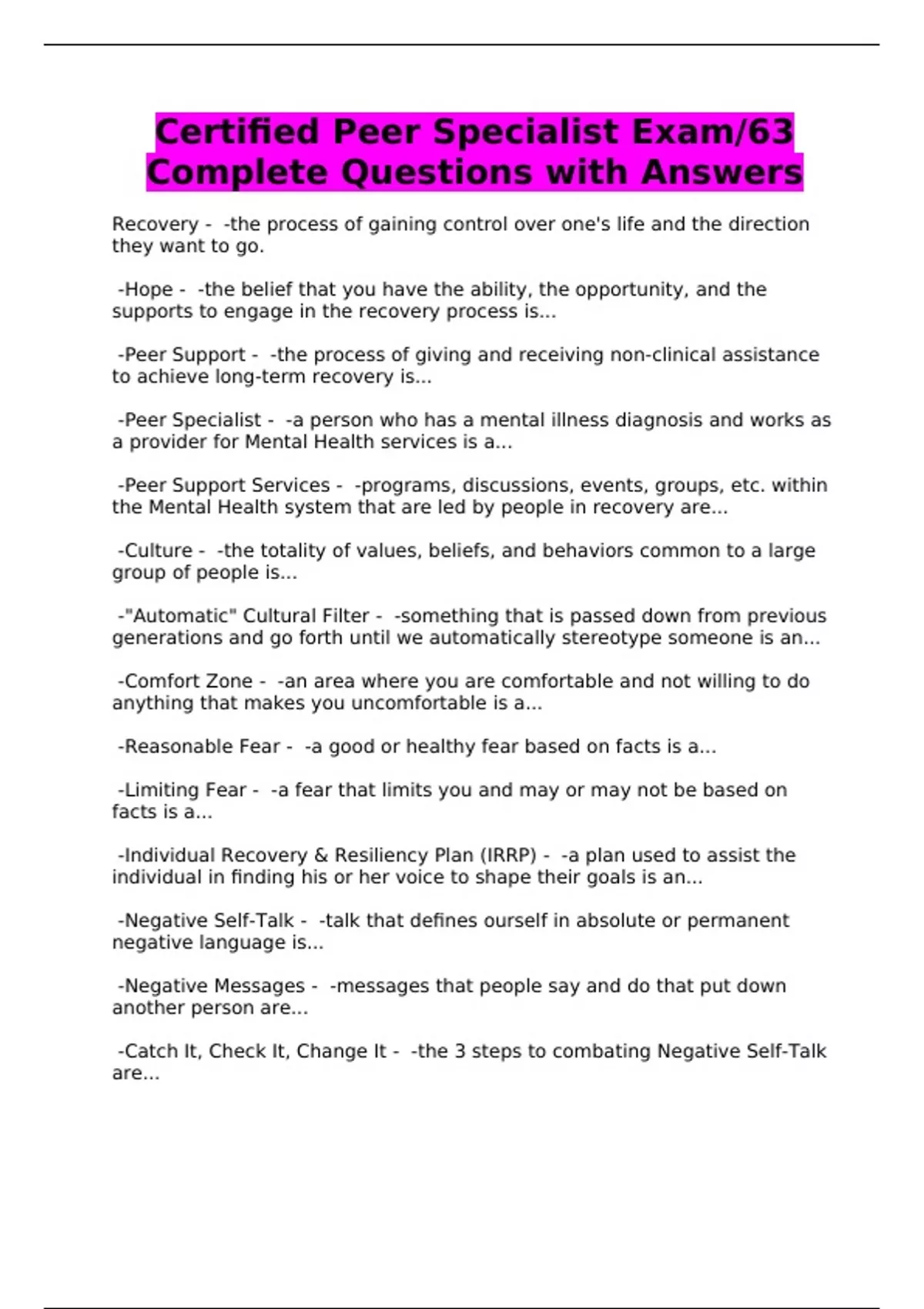Certified Peer Specialist Exam/63 Complete Questions with Answers