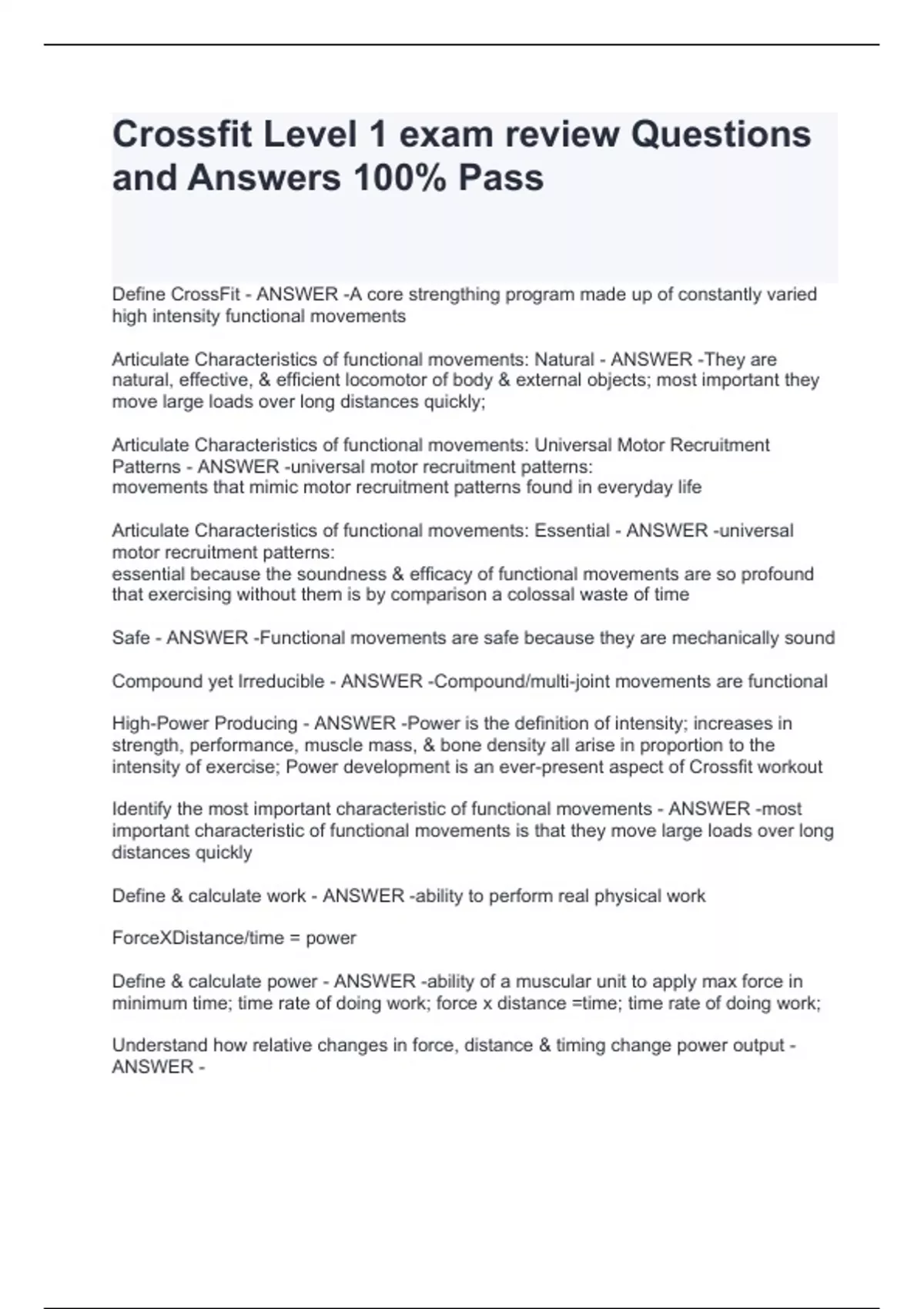 Define CrossFit - ANSWER -A core strengthing program made up of constantly varied high intensity functional movements Articulate Characteristics of functional movements: Natural - ANSWER -They are natural, effective, & efficient locomotor of body & external objects; most important they move large loads over long distances quickly; Articulate Characteristics of functional movements: Universal Motor Recruitment Patterns - ANSWER -universal motor recruitment patterns: movements that mimic motor recruitment patterns found in everyday life Articulate Characteristics of functional movements: Essential - ANSWER -universal motor recruitment patterns: essential because the soundness & efficacy of functional movements are so profound that exercising without them is by comparison a colossal waste of time Safe - ANSWER -Functional movements are safe because they are mechanically sound Compound yet Irreducible - ANSWER -Compound/multi-joint movements are functional High-Power Producing - ANSWER -Power is the definition of intensity; increases in strength, performance, muscle mass, & bone density all arise in proportion to the intensity of exercise; Power development is an ever-present aspect of Crossfit workout Identify the most important characteristic of functional movements - ANSWER -most important characteristic of functional movements is that they move large loads over long distances quickly Define & calculate work - ANSWER -ability to perform real physical work ForceXDistance/time = power Define & calculate power - ANSWER -ability of a muscular unit to apply max force in minimum time; time rate of doing work; force x distance =time; time rate of doing work; Understand how relative changes in force, distance & timing change power output - ANSWER - Describe intensity & how it is related to power - ANSWER -Power is the definition of intensity; increases in strength, performance, muscle mass, & bone density all arise in proportion to the intensity of exercise; Power development is an ever-present aspect of Crossfit workout Articulate the difference between specialization & CrossFit - ANSWER -Capacity culled from the intersection of all sports demands would quite logically lend itself well to all sport. In sum, our specialty is not specializing. What is fitness: Articulate CrossFit's definition of fitness & health & explain their relationship - ANSWER -CrossFit holds "fitness," "health," and "athleticism" as strongly overlapping constructs; fitness & health are the same thing; fitness, wellness, and pathology (sickness) are measures of the same entity: your health.