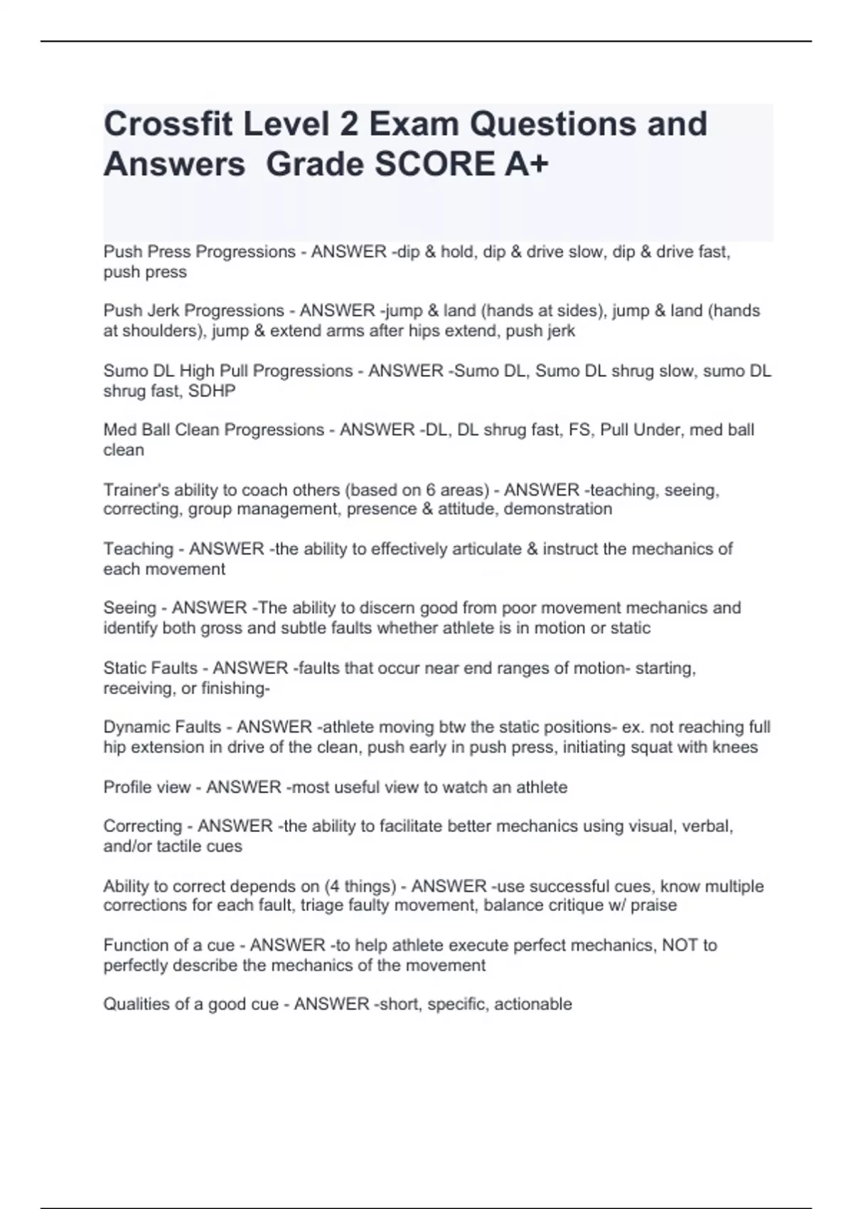 Crossfit Level 2 Exam Questions and Answers Grade SCORE A+
