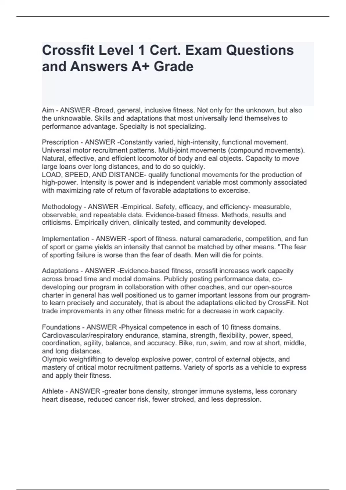 Crossfit Level 1 Cert. Exam Questions and Answers A+ Grade