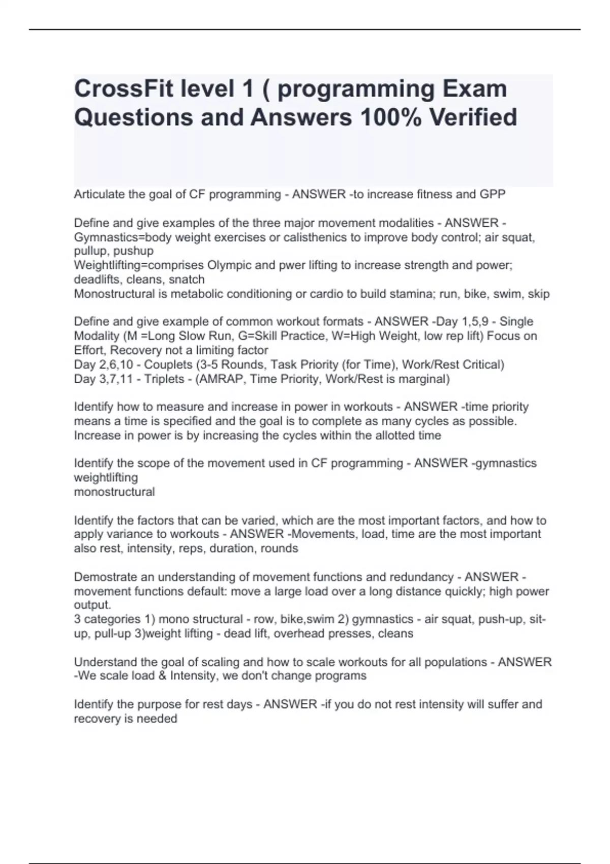 CrossFit level 1 ( programming Exam Questions and Answers 100% Verified