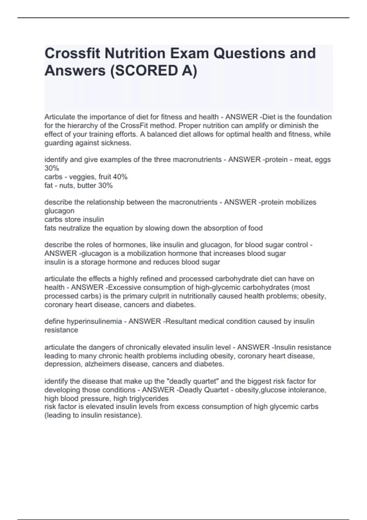 Crossfit Nutrition Exam Questions and Answers (SCORED A)