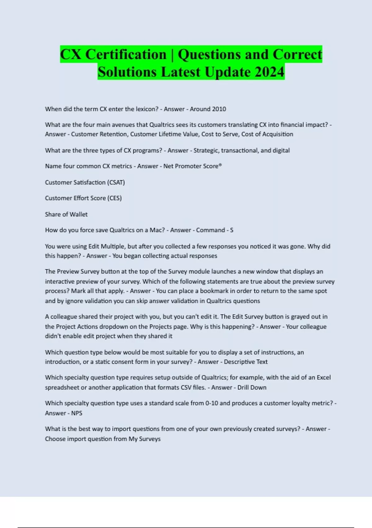 CX Certification | Questions and Correct Solutions Latest Update 2024 When did the term CX enter the lexicon? - Answer - Around 2010 What are the four main avenues that Qualtrics sees its customers translating CX into financial impact? - Answer - Customer Retention, Customer Lifetime Value, Cost to Serve, Cost of Acquisition What are the three types of CX programs? - Answer - Strategic, transactional, and digital Name four common CX metrics - Answer - Net Promoter Score® Customer Satisfaction (CSAT) Customer Effort Score (CES) Share of Wallet How do you force save Qualtrics on a Mac? - Answer - Command - S You were using Edit Multiple, but after you collected a few responses you noticed it was gone. Why did this happen? - Answer - You began collecting actual responses The Preview Survey button at the top of the Survey module launches a new window that displays an interactive preview of your survey. Which of the following statements are true about the preview survey process? Mark all that apply. - Answer - You can place a bookmark in order to return to the same spot and by ignore validation you can skip answer validation in Qualtrics questions A colleague shared their project with you, but you can't edit it. The Edit Survey button is grayed out in the Project Actions dropdown on the Projects page. Why is this happening? - Answer - Your colleague didn't enable edit project when they shared it Which question type below would be most suitable for you to display a set of instructions, an introduction, or a static consent form in your survey? - Answer - Descriptive Text Which specialty question type requires setup outside of Qualtrics; for example, with the aid of an Excel spreadsheet or another application that formats CSV files. - Answer - Drill Down Which specialty question type uses a standard scale from 0-10 and produces a customer loyalty metric? - Answer - NPS