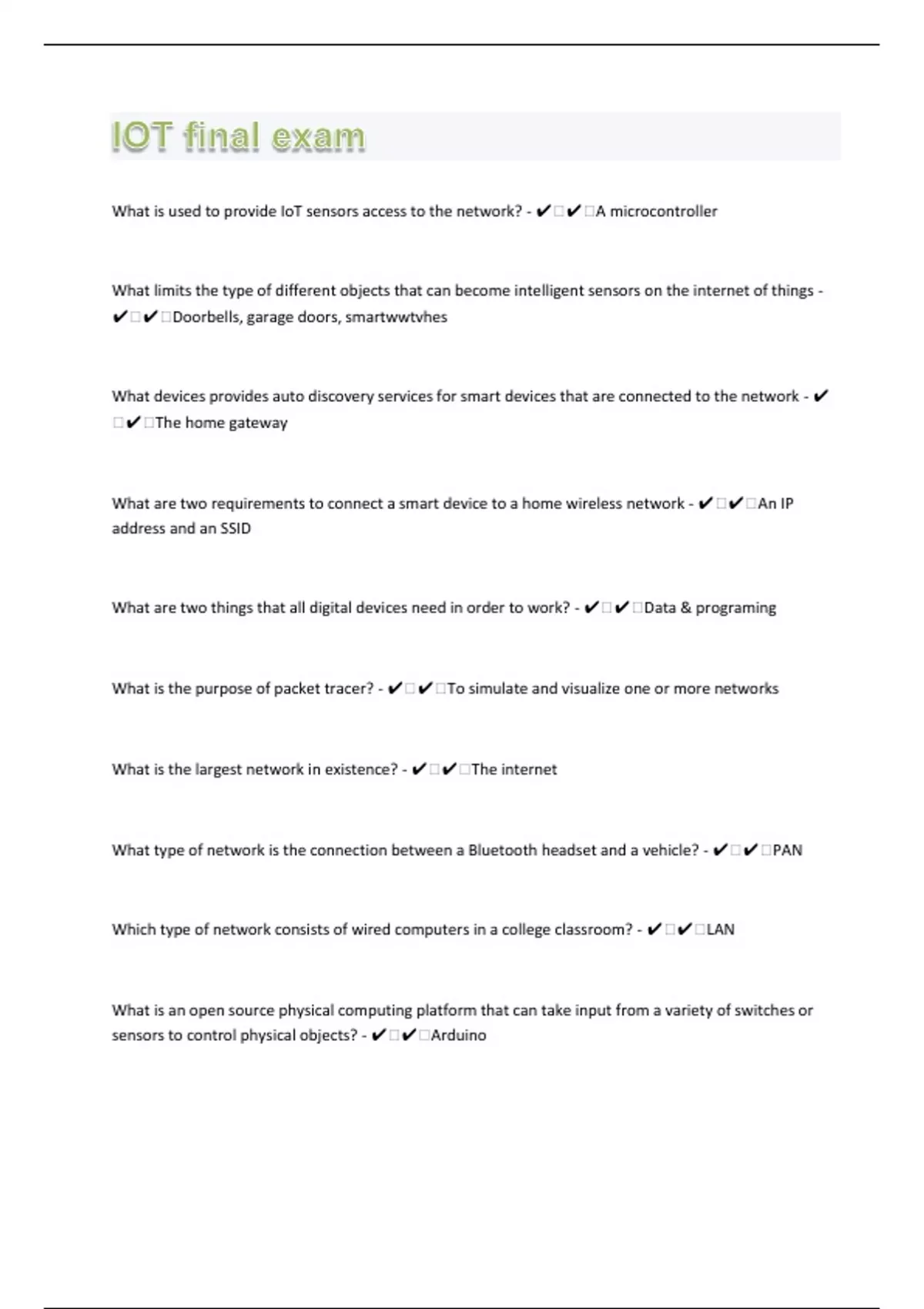What is used to provide IoT sensors access to the network? - ️️A microcontroller What limits the type of different objects that can become intelligent sensors on the internet of things - ️️Doorbells, garage doors, smart watches What devices provides auto discovery services for smart devices that are connected to the network - ️️The home gateway What are two requirements to connect a smart device to a home wireless network - ️️An IP address and an SSID What are two things that all digital devices need in order to work? - ️️Data & programing What is the purpose of packet tracer? - ️️To simulate and visualize one or more networks What is the largest network in existence? - ️️The internet What type of network is the connection between a Bluetooth headset and a vehicle? - ️️PAN Which type of network consists of wired computers in a college classroom? - ️️LAN What is an open source physical computing platform that can take input from a variety of switches or sensors to control physical objects? - ️️Arduino