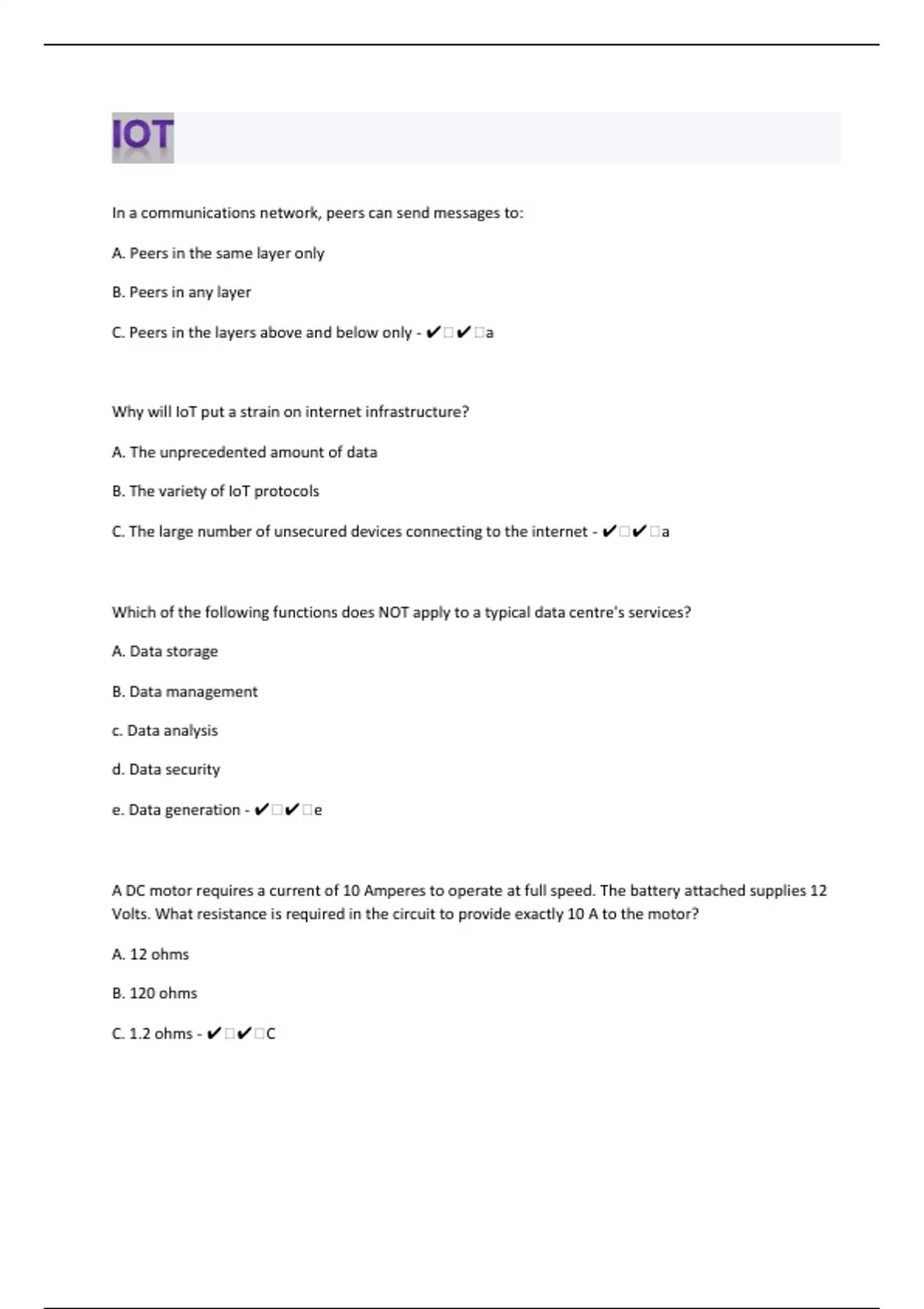 In a communications network, peers can send messages to: A. Peers in the same layer only B. Peers in any layer C. Peers in the layers above and below only - ️️a Why will IoT put a strain on internet infrastructure? A. The unprecedented amount of data B. The variety of IoT protocols C. The large number of unsecured devices connecting to the internet - ️️a Which of the following functions does NOT apply to a typical data centre's services? A. Data storage B. Data management c. Data analysis d. Data security e. Data generation - ️️e A DC motor requires a current of 10 Amperes to operate at full speed. The battery attached supplies 12 Volts. What resistance is required in the circuit to provide exactly 10 A to the motor? A. 12 ohms B. 120 ohms C. 1.2 ohms - ️️C