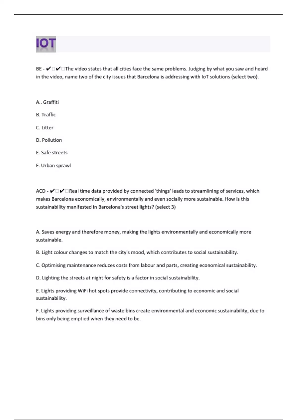 BE - ️️The video states that all cities face the same problems. Judging by what you saw and heard in the video, name two of the city issues that Barcelona is addressing with IoT solutions (select two). A.. Graffiti B. Traffic C. Litter D. Pollution E. Safe streets F. Urban sprawl ACD - ️️Real time data provided by connected 'things' leads to streamlining of services, which makes Barcelona economically, environmentally and even socially more sustainable. How is this sustainability manifested in Barcelona's street lights? (select 3) A. Saves energy and therefore money, making the lights environmentally and economically more sustainable. B. Light colour changes to match the city's mood, which contributes to social sustainability. C. Optimising maintenance reduces costs from labour and parts, creating economical sustainability. D. Lighting the streets at night for safety is a factor in social sustainability. E. Lights providing WiFi hot spots provide connectivity, contributing to economic and social sustainability. F. Lights providing surveillance of waste bins create environmental and economic sustainability, due to bins only being emptied when they need to be.