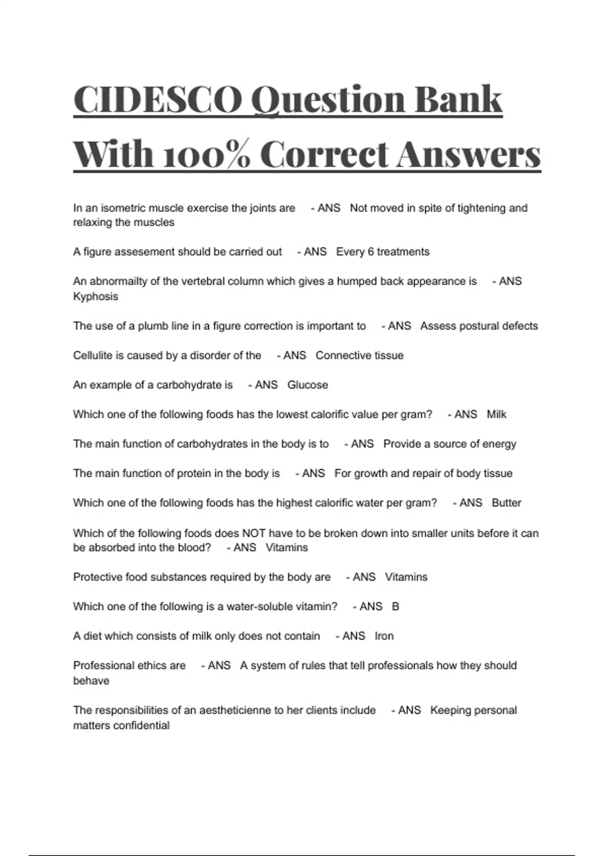 In an isometric muscle exercise the joints are - ANS Not moved in spite of tightening and relaxing the muscles A figure assesement should be carried out - ANS Every 6 treatments An abnormailty of the vertebral column which gives a humped back appearance is - ANS Kyphosis The use of a plumb line in a figure correction is important to - ANS Assess postural defects Cellulite is caused by a disorder of the - ANS Connective tissue An example of a carbohydrate is - ANS Glucose Which one of the following foods has the lowest calorific value per gram? - ANS Milk The main function of carbohydrates in the body is to - ANS Provide a source of energy The main function of protein in the body is - ANS For growth and repair of body tissue Which one of the following foods has the highest calorific water per gram? - ANS Butter Which of the following foods does NOT have to be broken down into smaller units before it can be absorbed into the blood? - ANS Vitamins Protective food substances required by the body are - ANS Vitamins Which one of the following is a water-soluble vitamin? - ANS B A diet which consists of milk only does not contain - ANS Iron Professional ethics are - ANS A system of rules that tell professionals how they should behave The responsibilities of an aestheticienne to her clients include - ANS Keeping personal matters confidential The responsibilities of an aestheticienne to her employer include - ANS Taking pride in maintaining a good reputation for the business The responsibilities of an employer to her employees include - ANS Expressing professional pride in employees regarding the quality of their performance A good relationship with the medical profession can be developed and maintained by - ANS Recommending clients with contra-indications to visit their doctor An aestheticienne can maintain good relations with colleagues in her profession by - ANS Exchanging information and being helpful to each other An aestheticienne can maintain a good relationship with the media by - ANS Regularly providing the media with news of her profession An electrical treatment that uses sound waves is - ANS Audio sonic An electrical treatment that is used for toning muscles is - ANS Inferential The effect of a laser treatment can be to - ANS Help remove tattoos The main purpose of a brush machine is to - ANS Remove dead cells from the skins surface Vacuum suction treatment should not be used on - ANS An inflammed skin Desincrustation is a treatment mainly used on - ANS Oily skins The infra-red lamp should NOT be used on a skin that - ANS Has dilated capillaries During the first part of desincrustation, the positive pole of the galvanic unit should - ANS Be held in the clients hand A contra-indication to vacuum suction treatment is - ANS A spider naevus A method of forcing water soluble substances into the skin using an electric current is - ANS Iontophoresis Permanent hair removal takes place by - ANS Electrical epilation Lymph drainage is performed correctly if the beauty therapist gives - ANS Pumping movements on the tissue Intermittent pressure is used to - ANS Remove liquid out of the muscle tissue Which one of the following statements is correct? - ANS Warm water and vapour cause hyperaemia in the skin resulting in an increased glandular activity The main effect of desincrustation is the - ANS Production of alkali at the cathode Ozone is formed during - ANS High frequency machine A usual purification of the skin is performed - ANS With steam or steam and herbs A galvanic current is used during - ANS Desincrustation The massage movement in which the skin is grasped between the thumb and forefinger is called - ANS Petrissage Strengthening weakened muscles of facial expression can be best achieved using - ANS Finger tapotements A contra-indication to a full body massage is - ANS A recent removal of malignant tissue Frictions, small circular movements performed with pads of thumbs or fingers are most effective - ANS Around joint areas The purpose of friction movements is to - ANS Disperse local pockets of oedema Rapid muscle contractions in the therapists hands produce the massage movement known as - ANS Vibration The most stimulating massage movement is - ANS Tapotement A heavy jaw outline with much fatty tissue can be treated with - ANS Tapotements and petrissages In case of fluid accumulation under the eyes, the so called bags - ANS Give a drainage from the nose eye corner towards the temporal bone Tapotement particularly influence - ANS Muscle tone The medium used during a full body massage is - ANS Oil When giving a massage, hand mobility is important for maintaining a - ANS Regular rhythm If it becomes necessary for the therapist to interrupt a massage treatment, the hands should - ANS Be feathered off the clients body When giving a massage, it is important that the client be - ANS Fully relaxed For freedom of movement and to reduce fatigue, it is important for the therapist to - ANS Maintain correct posture A treatment used on the feet to release toxins and improve circulation is - ANS Reflexology A client should cleanse her skin to - ANS Remove surface dirt A client should tone her skin to - ANS Remove excess cleanser The main aim of skin cleansing is to - ANS Remove surface dirt and make up Which one of the following is NOT a method of cleansing the skin - ANS Astringent lotion The qualities of a skin cleanser are that it should - ANS All of the above Advice that should be given to a client for skin cleansing at home - ANS Cleanse and tone twice a day Which of the following statements are correct? - ANS 1 is correct and 2 is incorrect Which of the following statements are correct? - ANS Both are incorrect The function of deodorant is to - ANS Prevent body odour The active ingredient of a deodorant is - ANS An antiseptic The action of a deodorant is to - ANS Control the bacteria responsible for body odour The function of an anti-perspirant is to - ANS Reduce the amount of sweat on the skin T